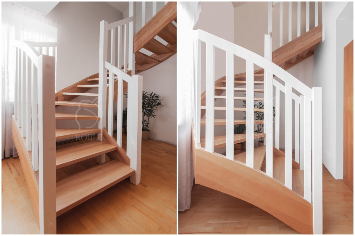 Roble Open Riser - Closed String Winder Stairs RS20 | Wood: beech | Finish: oil | Color: individually colored | Steps thickness: 4cm | Stringers: beech | Balustrade: beech wood white painted balusters