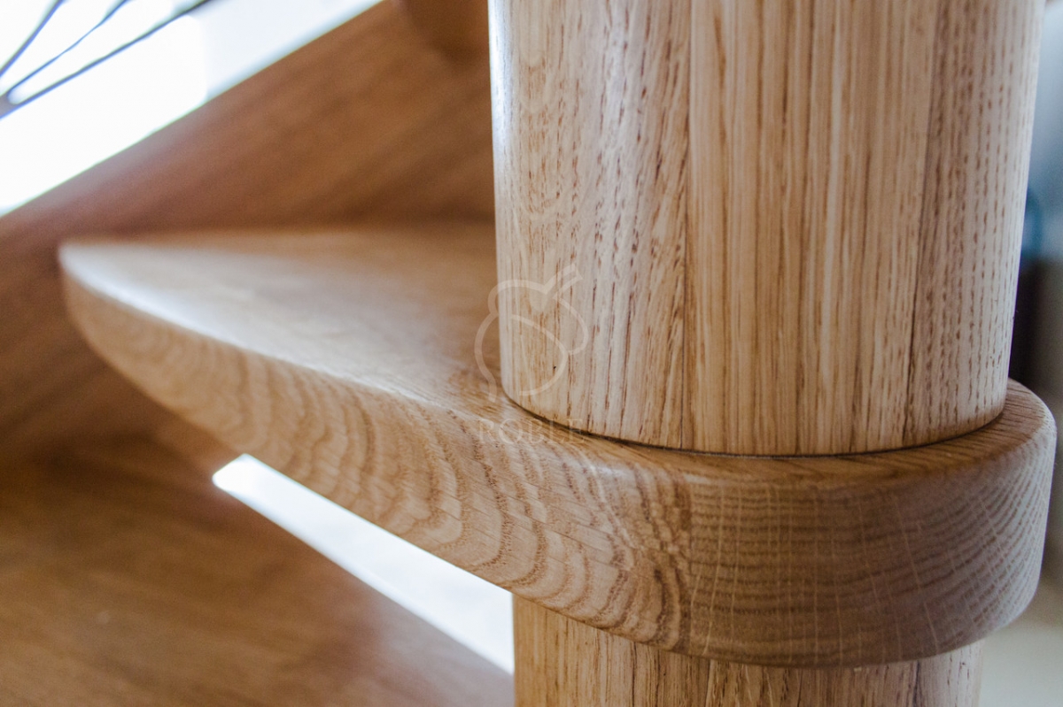 Roble Curved Spiral Stairs SR25 | Steps: oak in natural colour | Strings: curved exotic wood base with oak veneer in natural colour | Steps thickness: 4cm | Balustrade: Individually designed, forged steel with curved oak handrail