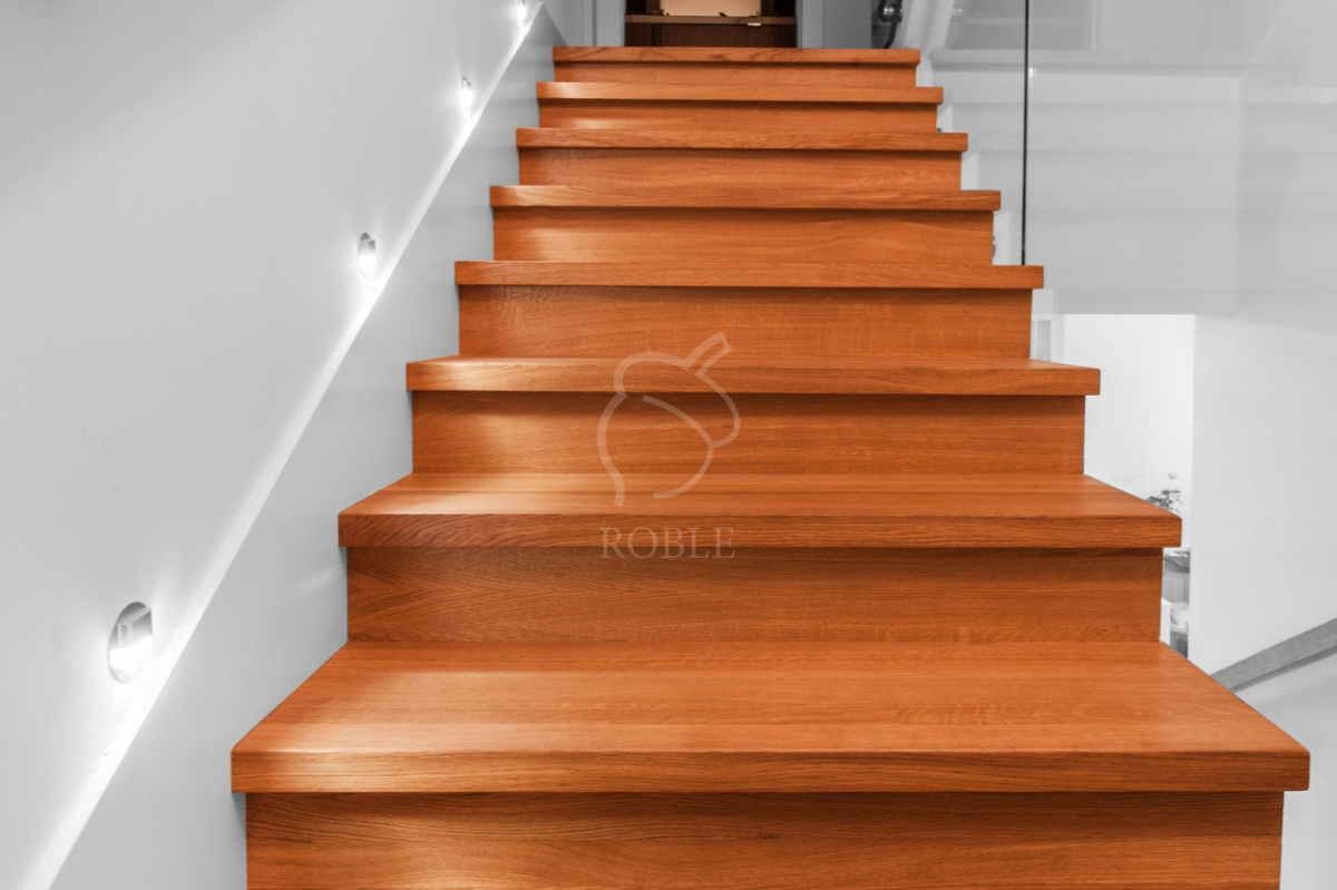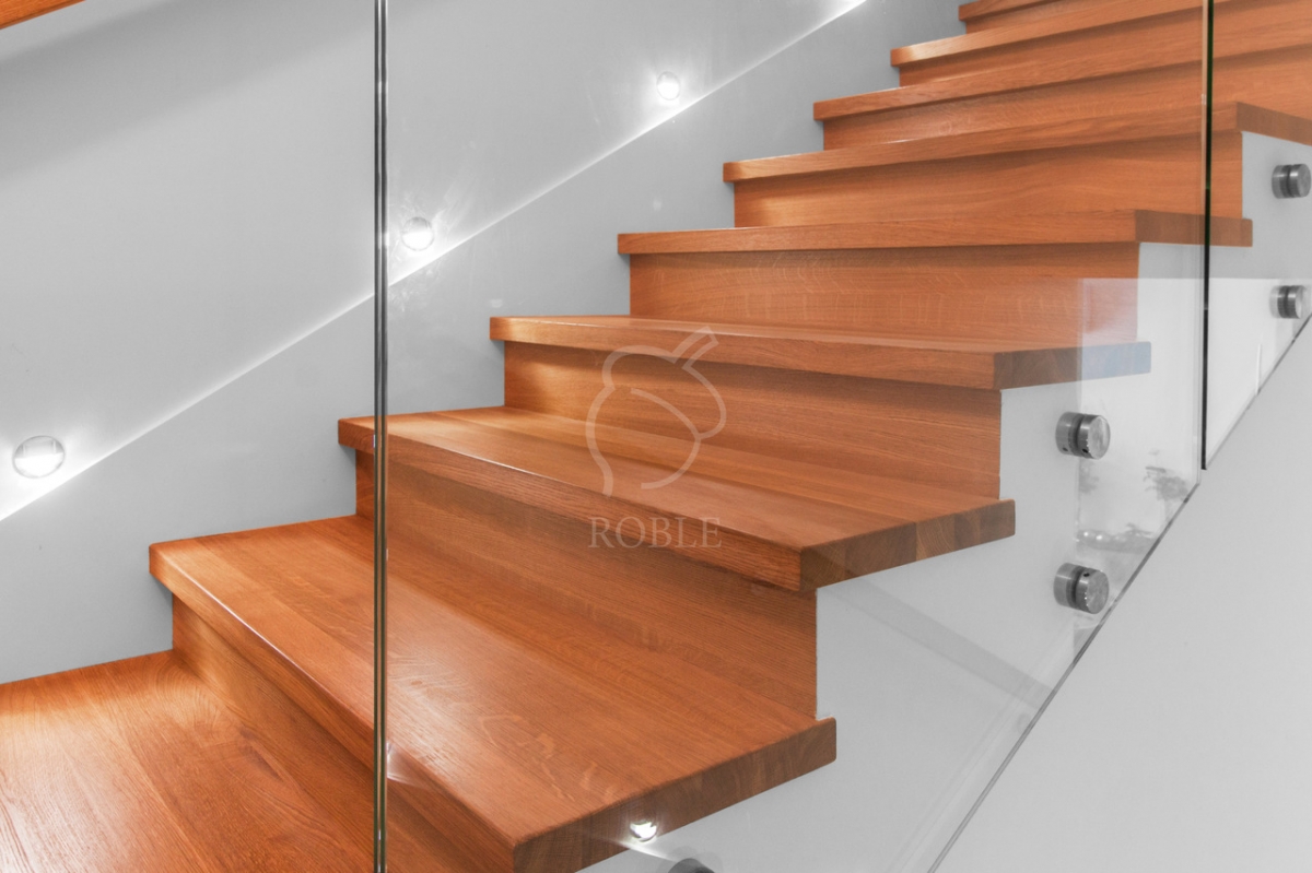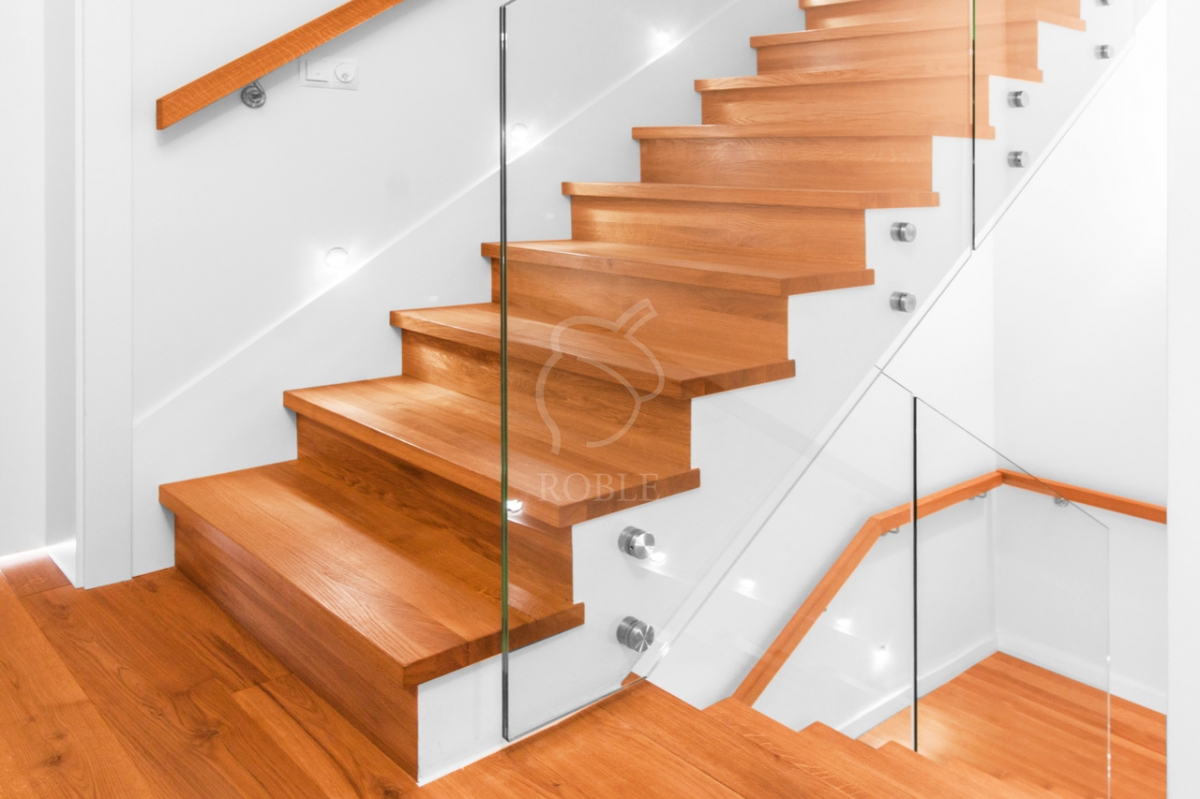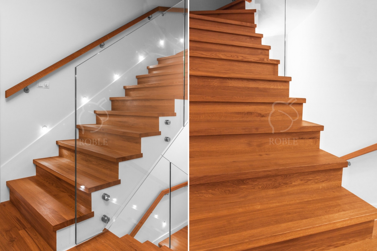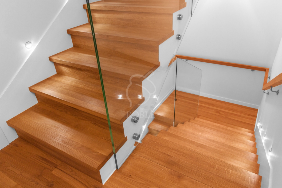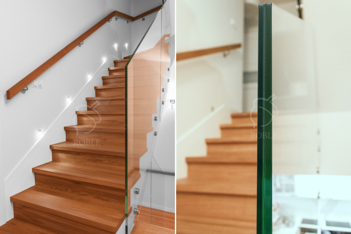 | Wood: oak | Finish: hard wax-oil | Color: natural | Balustrade: float glass + oak wood