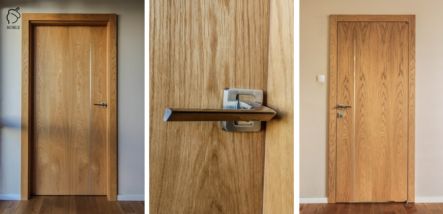 Roble Wooden Door | Wood: oak | Dimensions: 90 x 200cm | Finish: natural oil | Vertical aluminum insert | Non-rebated door | Adjustable door frame | Magnetic locks | Hidden hinges