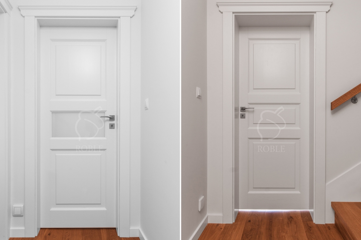 Roble Oak Interior Door | Wood: oak, white painted | Glass inserts | Dimensions: 90 x 200cm | Finish: lacquer | Non-rebated door | Stylized, adjustable door frame | Magnetic locks | Hidden hinges