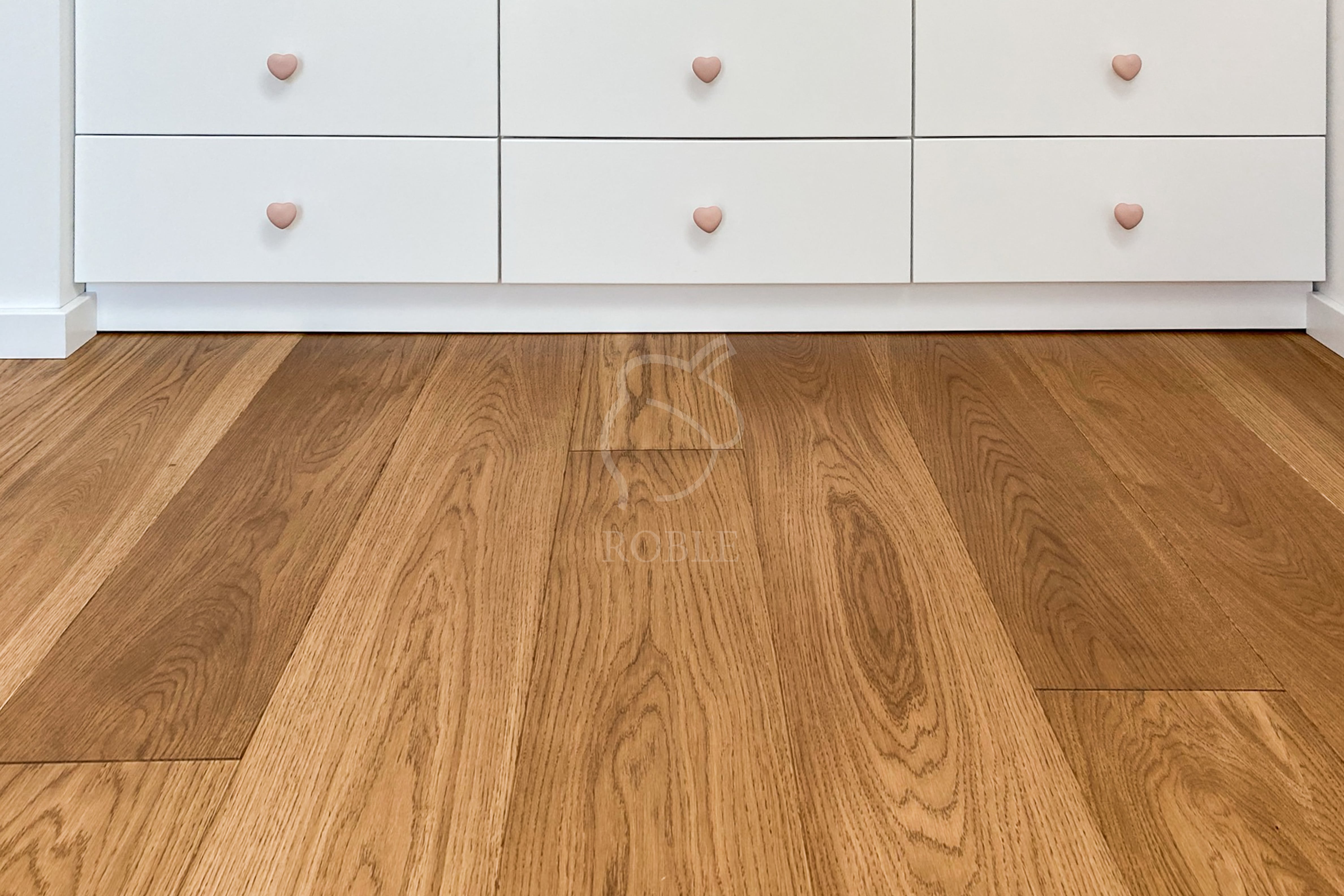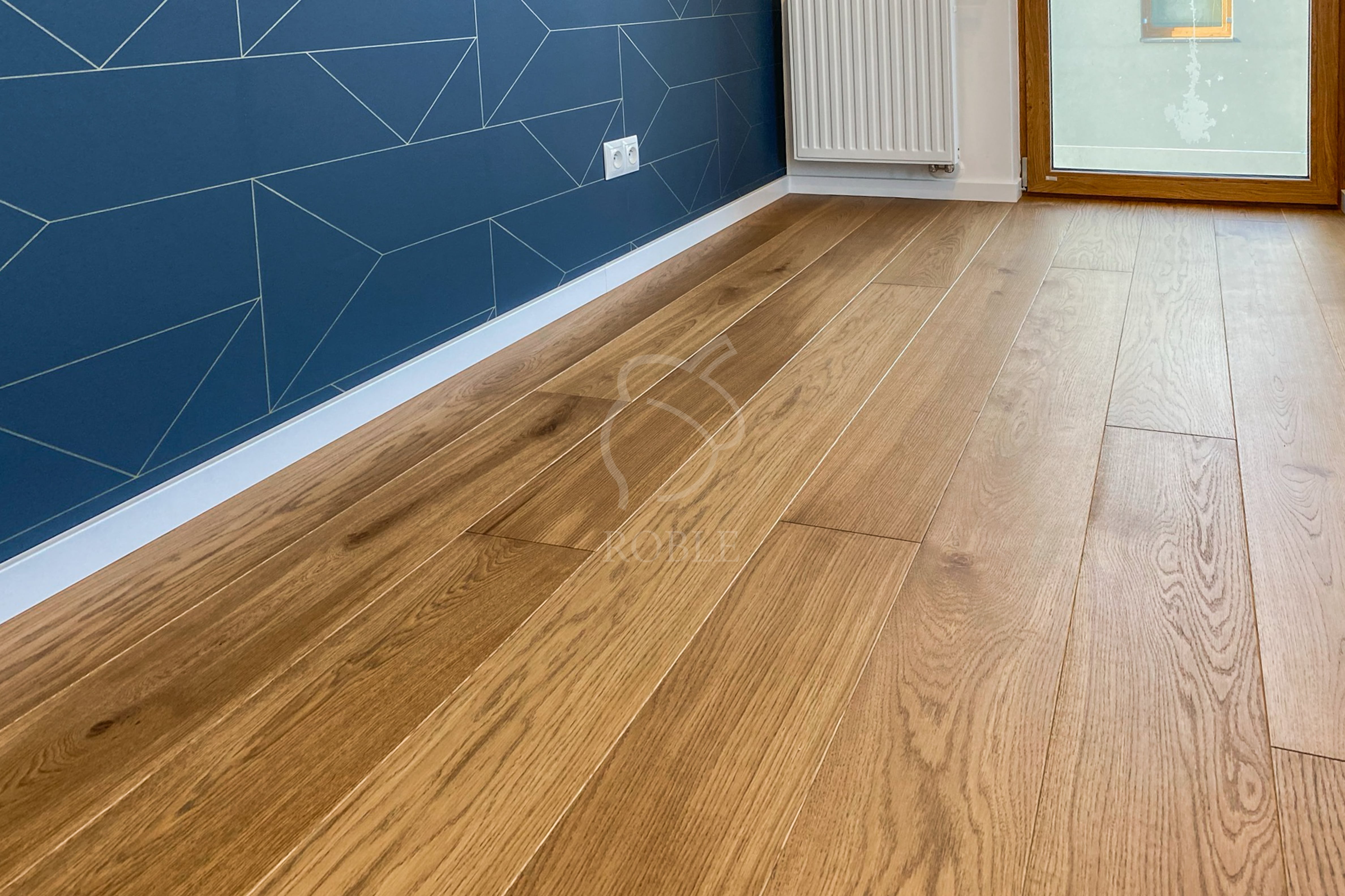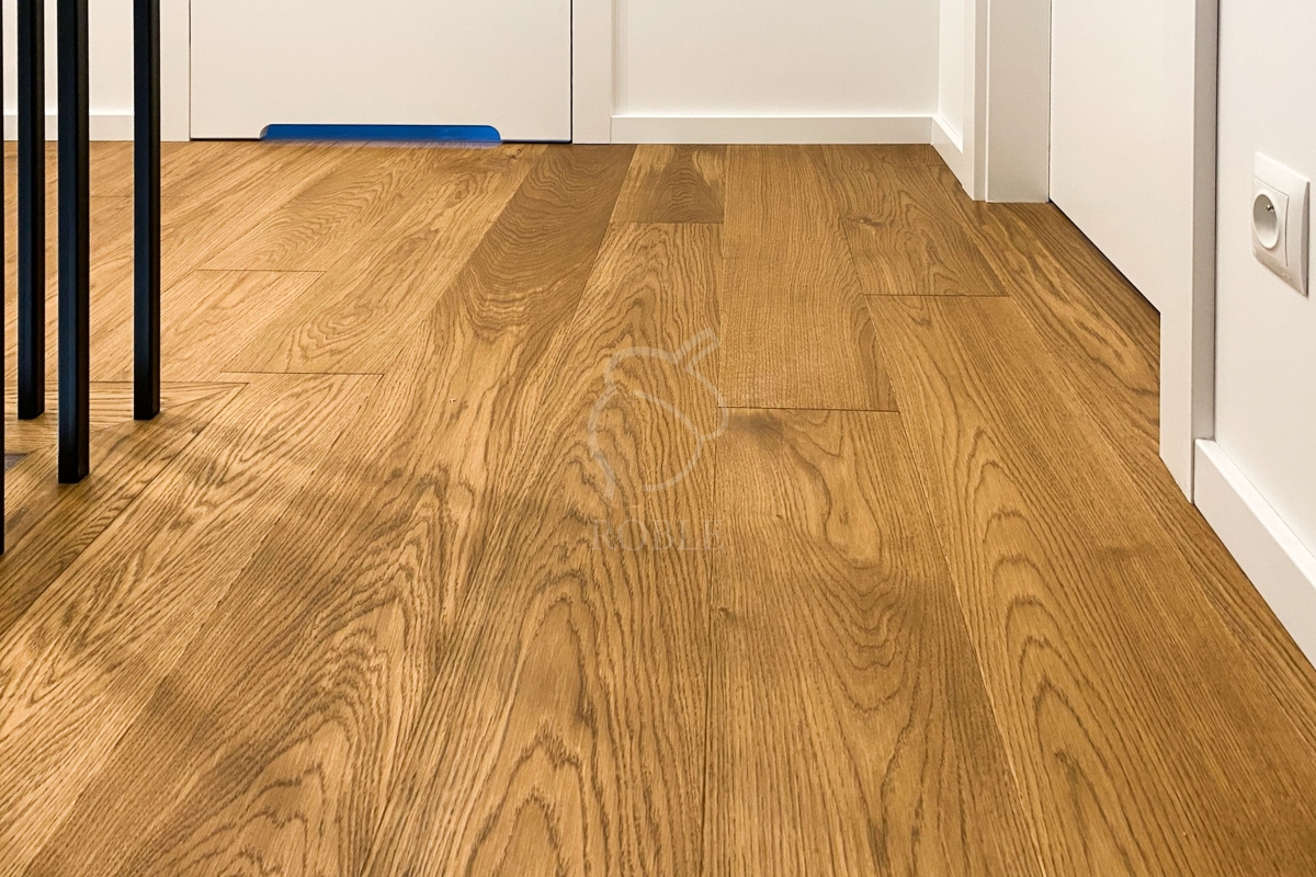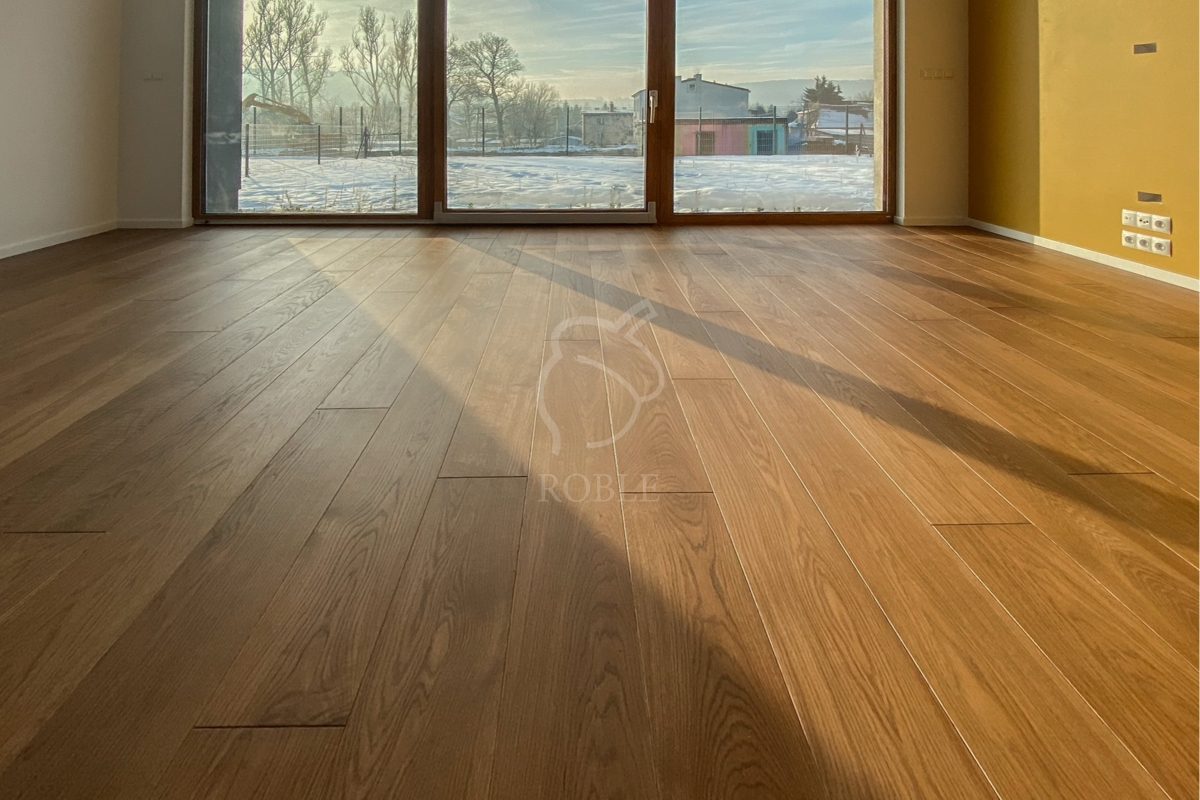 Roble Deska Warstwowa | Drewno: dąb | Kolor: wg próbki | Klasa: mix | Długości: od 1,0 do 2,1m | Szerokość: 18cm | Grubość: 14mm (4mm litego drewna) | Wykończenie: twardy wosk olejny | 4-stronnie fazowana | Strukturyzacja powierzchni