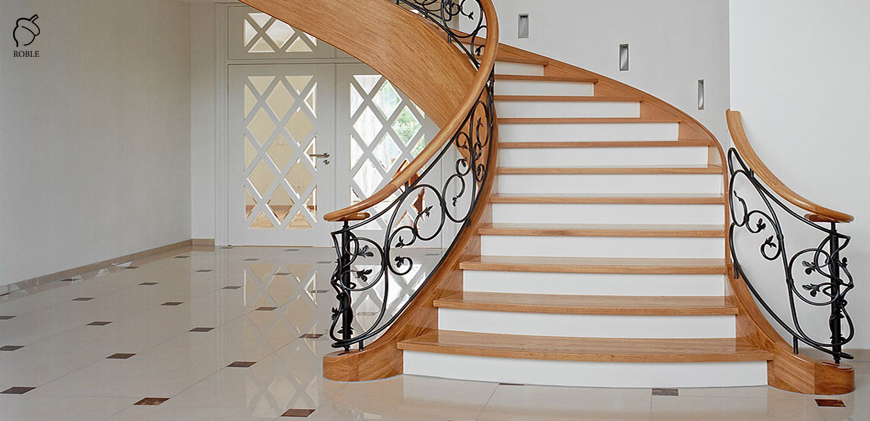 | Stopień: dąb odcień naturalny | Podstopień: dąb malowany na biało | Grubość stopni: 4cm | Balustrada: kuta, przygotowywana pod projekt z poręczą drewnianą lakierowaną, odcień naturalny