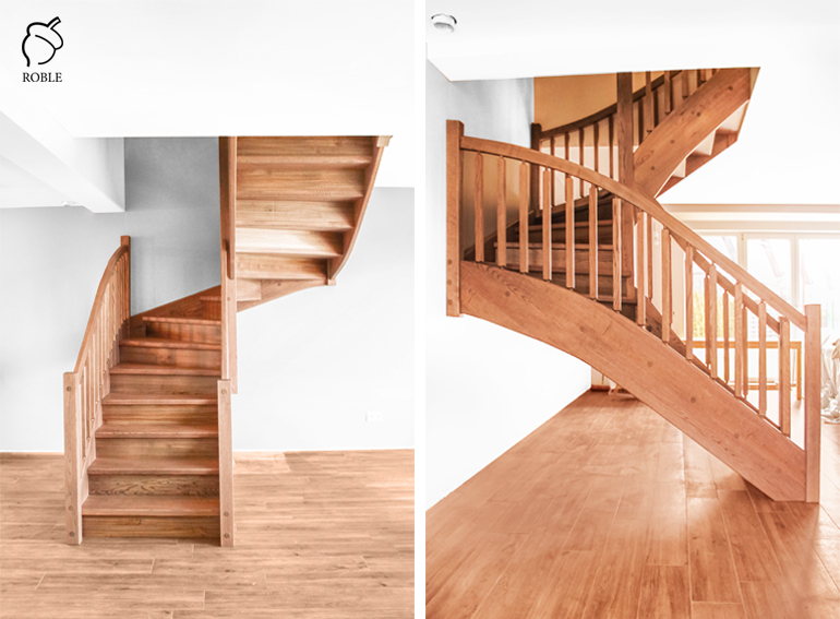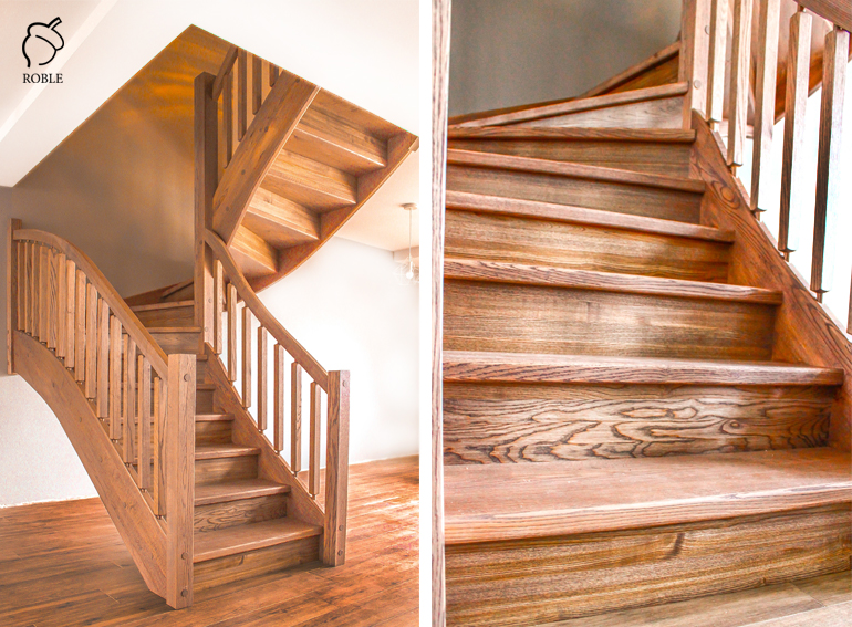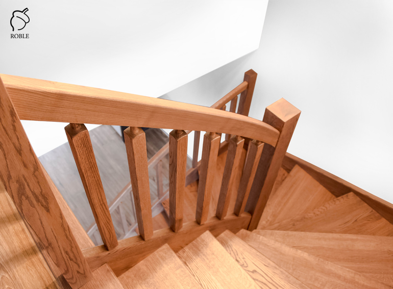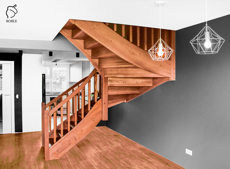 | Drewno: dąb | Wykończenie: twardy wosk olejny | Kolor: barwione pod kolor podłogi | Balustrada: drewniana wg projektu