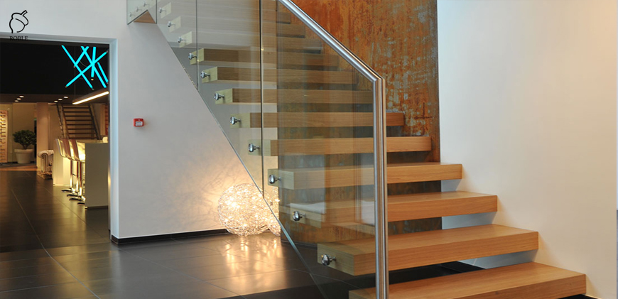 | Drewno: dąb | Wykończenie: lakier mat | Kolor: odcień naturalny | Grubość stopni: 10cm | Balustrada: szkło na rotulach ze stalową poręczą