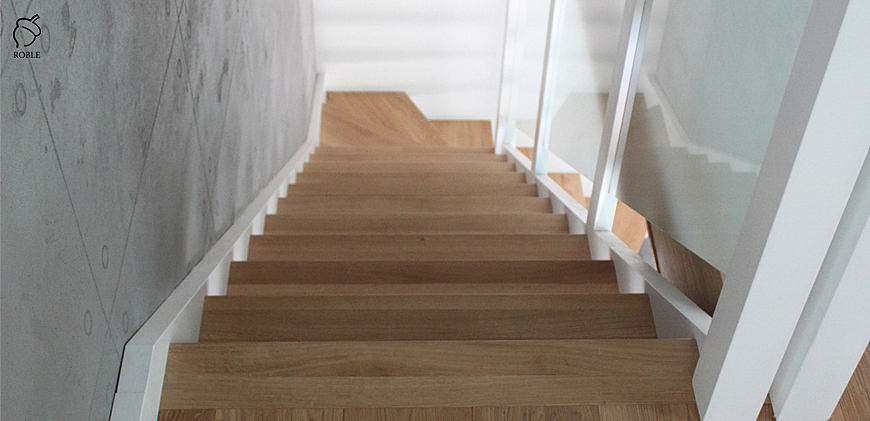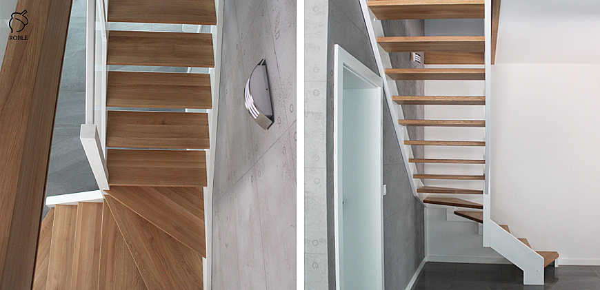 Roble Schody Poczlikowo-Siodłowe Ażurowe RS17 | Drewno: dąb | Wykończenie: lakier mat | Kolor: barwione pod kolor podłogi | Grubość stopni: 4cm | Policzki: dąb lakierowany na biało | Balustrada: kurtynowa szklana z dębowymi tralkami i pochwytem