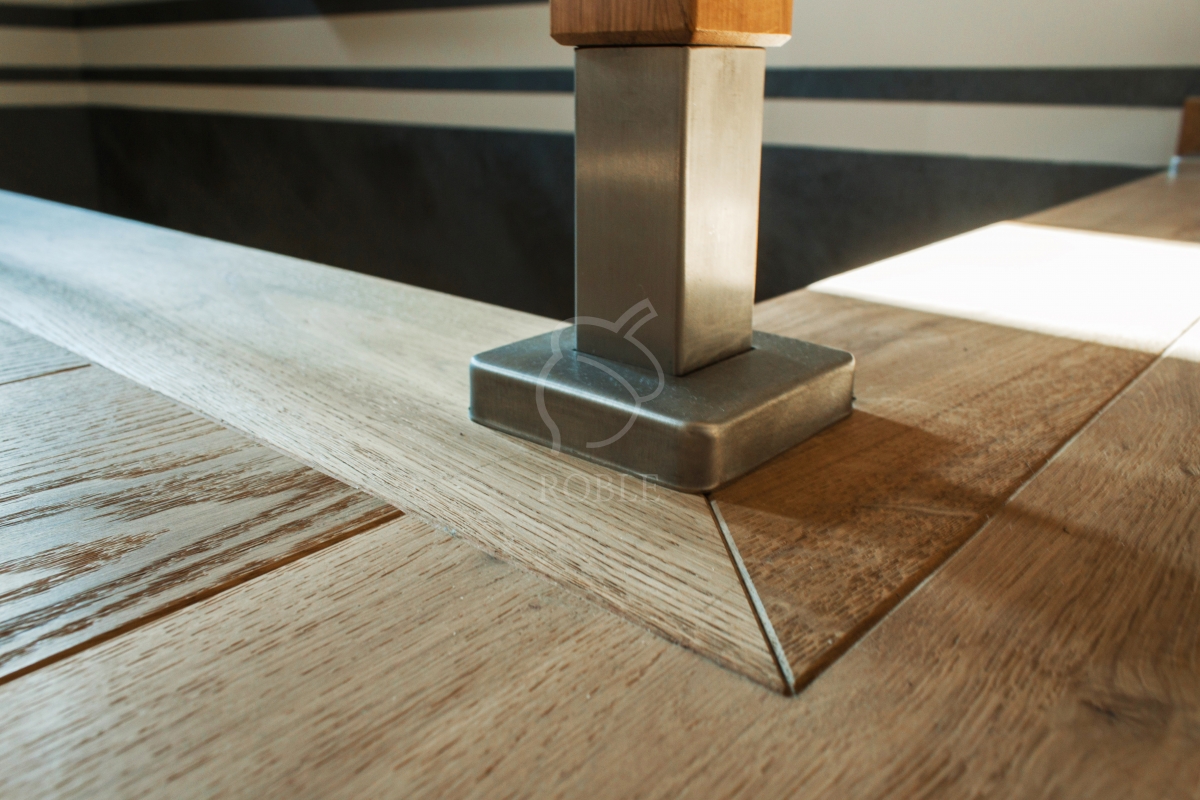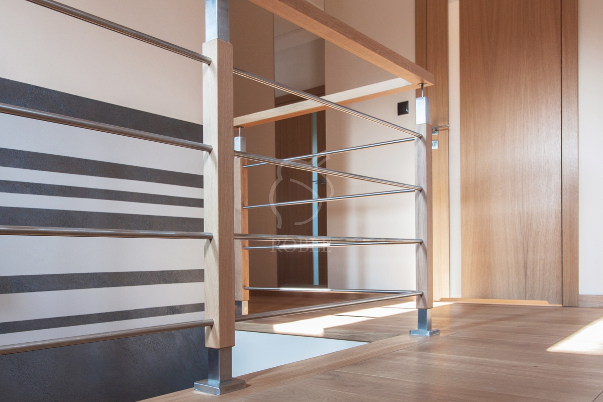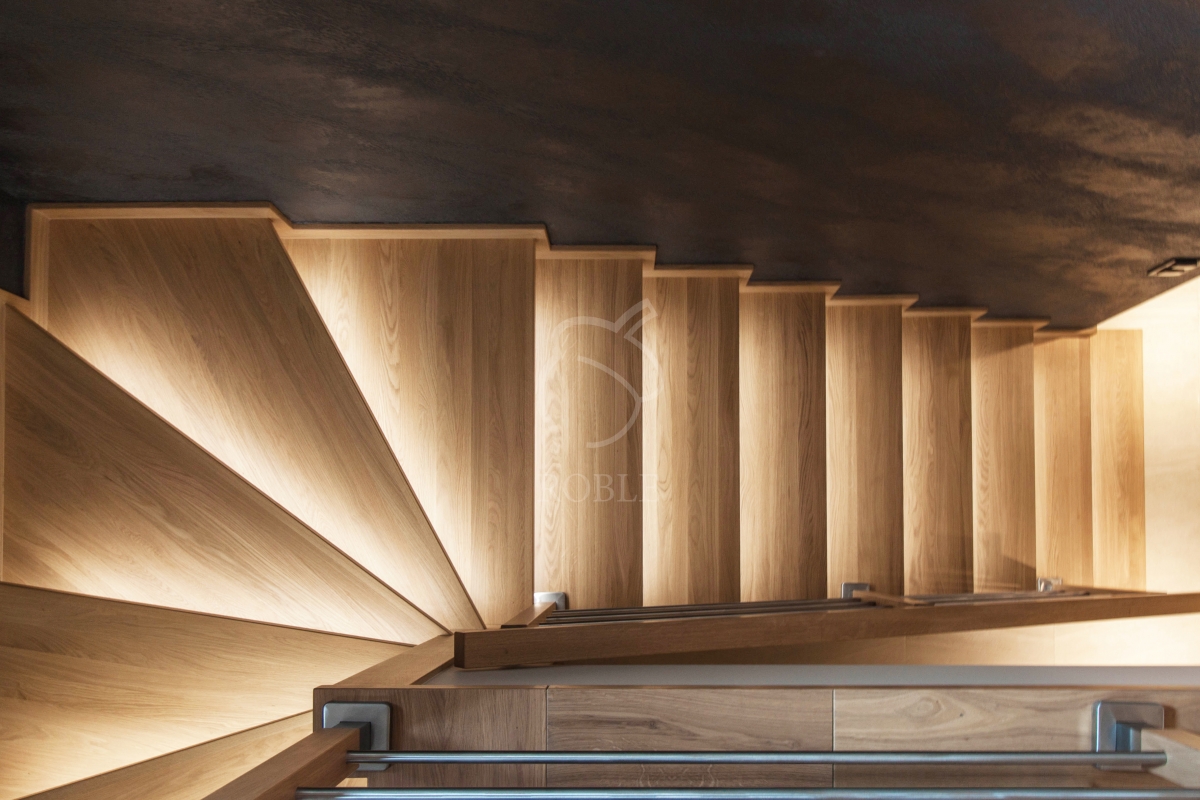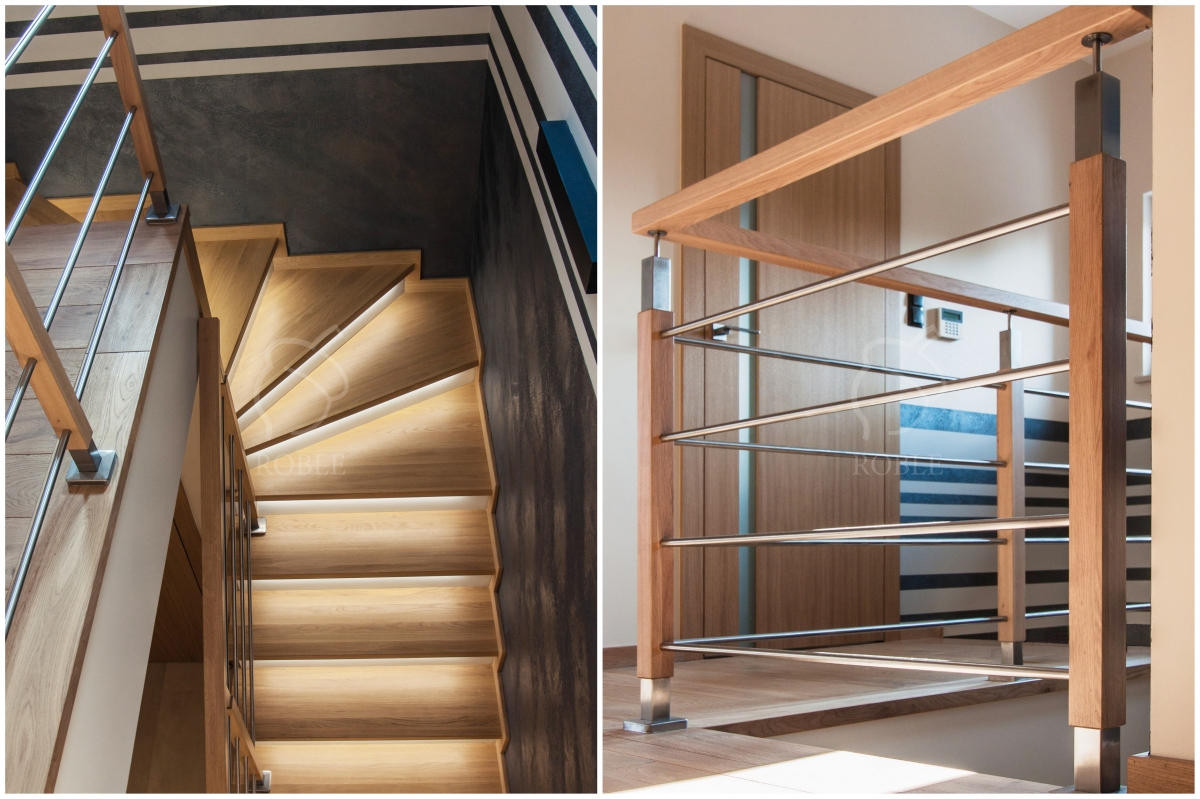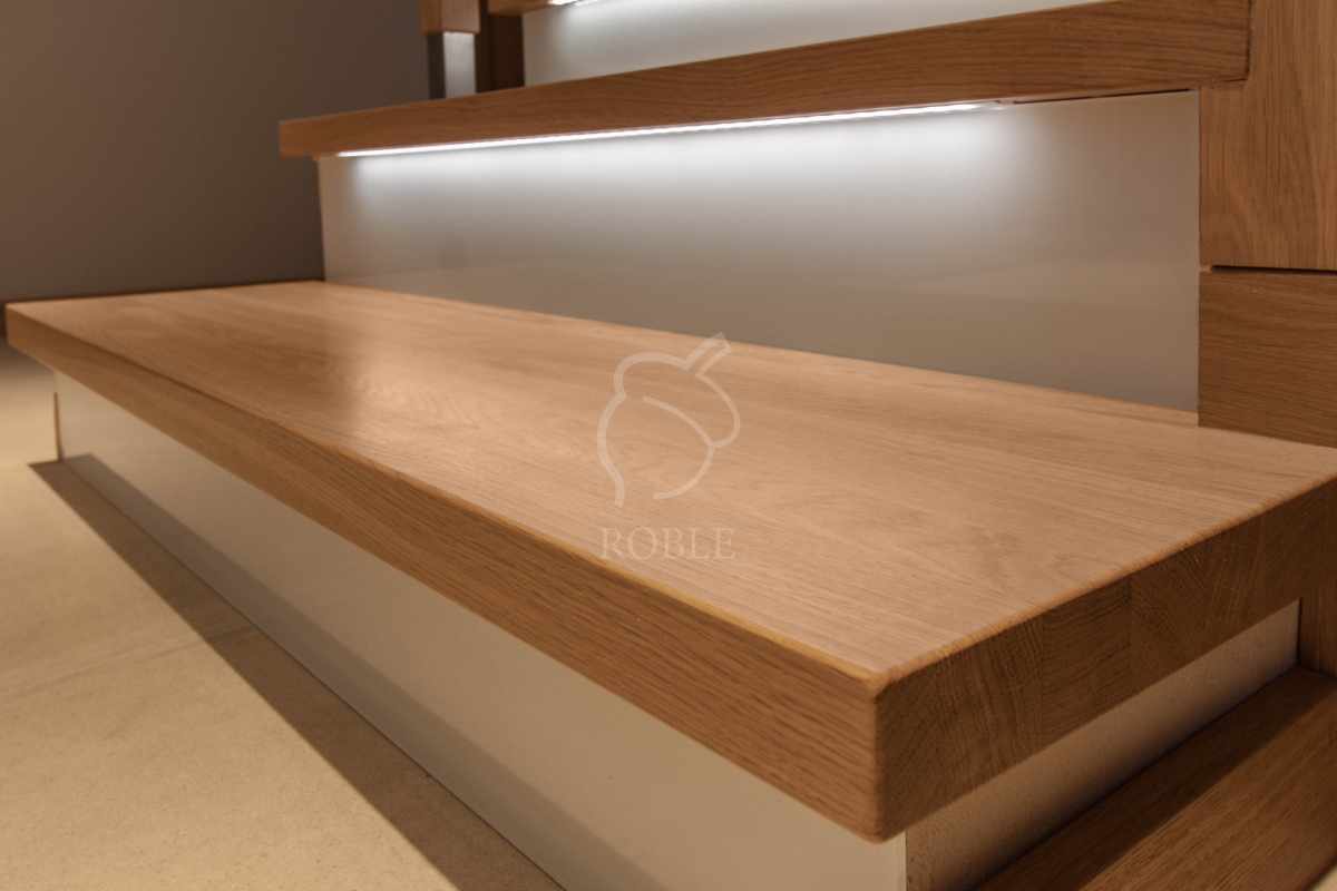 Roble Schody na Beton SR19 | Materiał stopni: dąb | Wykończenie stopni: lakier półmat | Kolor stopni: barwione indywidualnie | Materiał podstopni: lacobel | Oświetlenie LED | Balustrada: stal + dąb