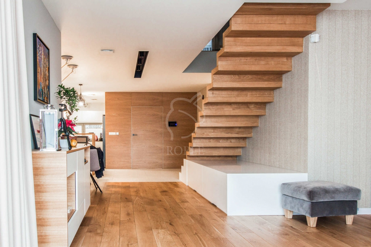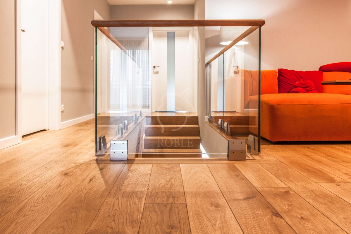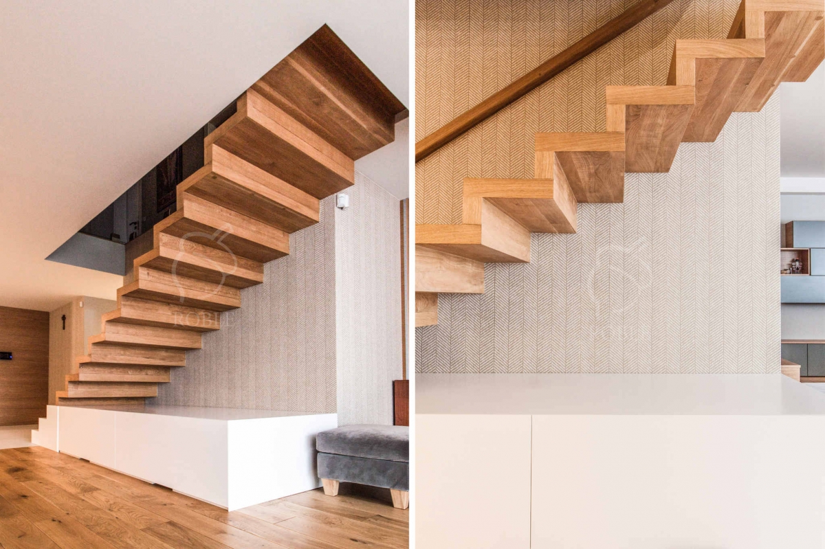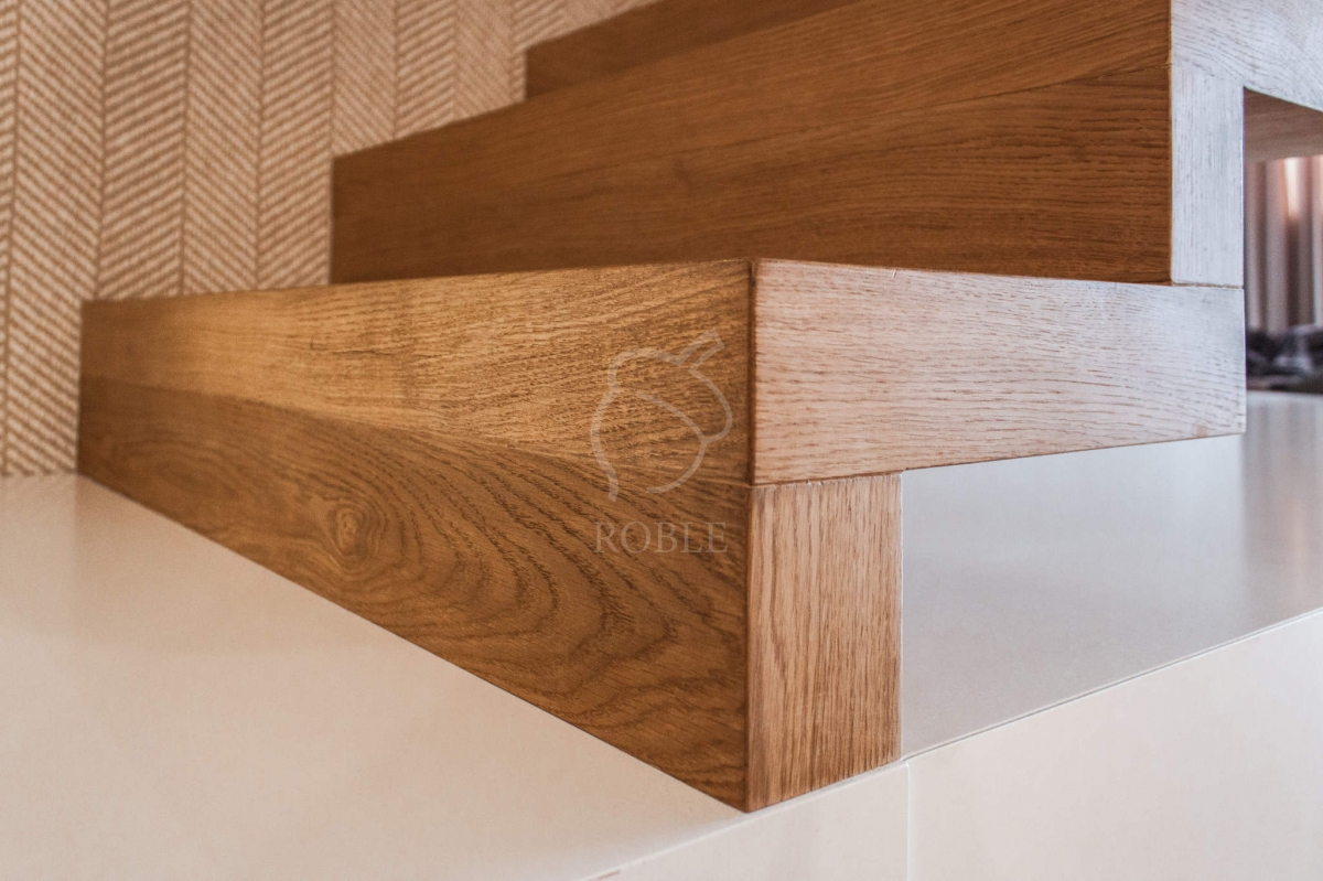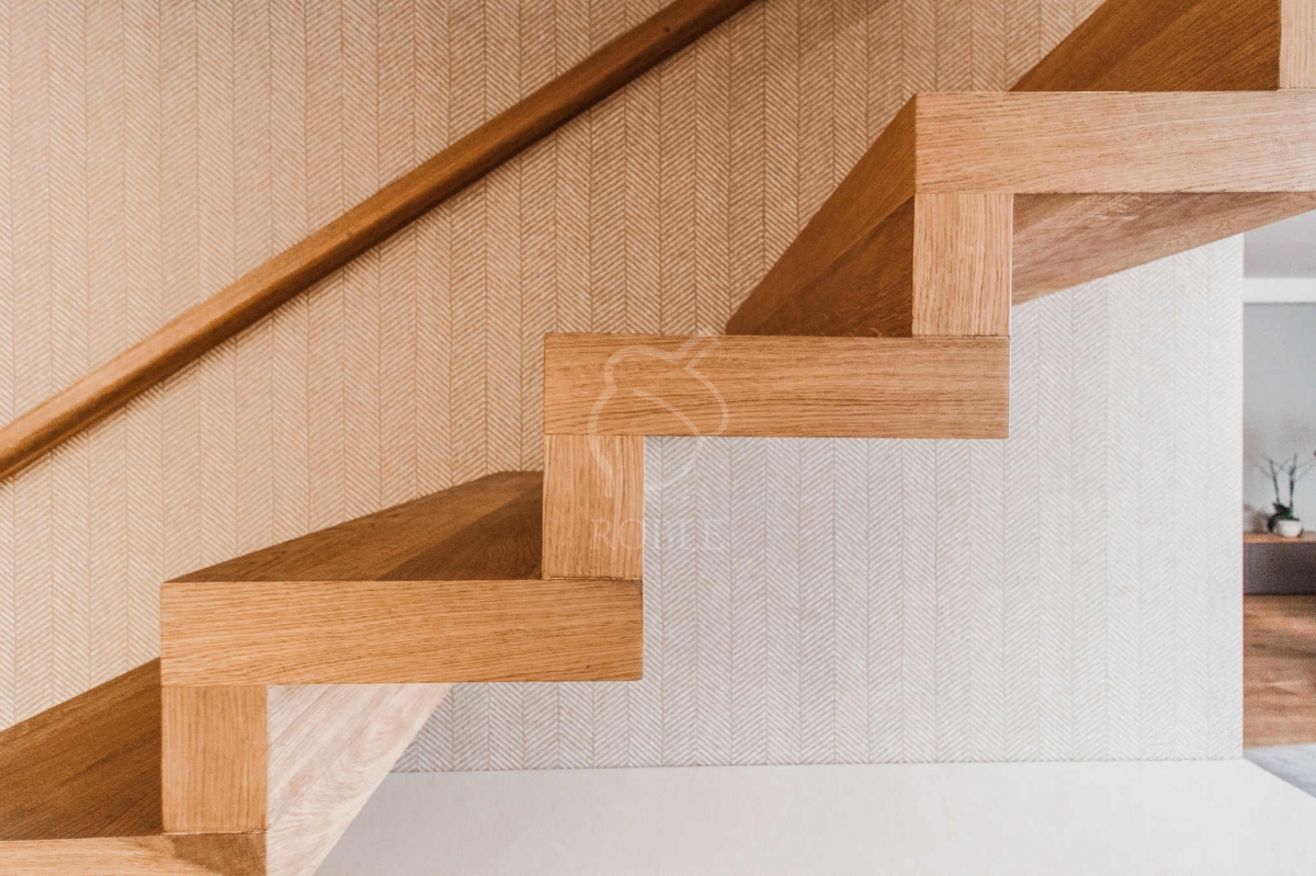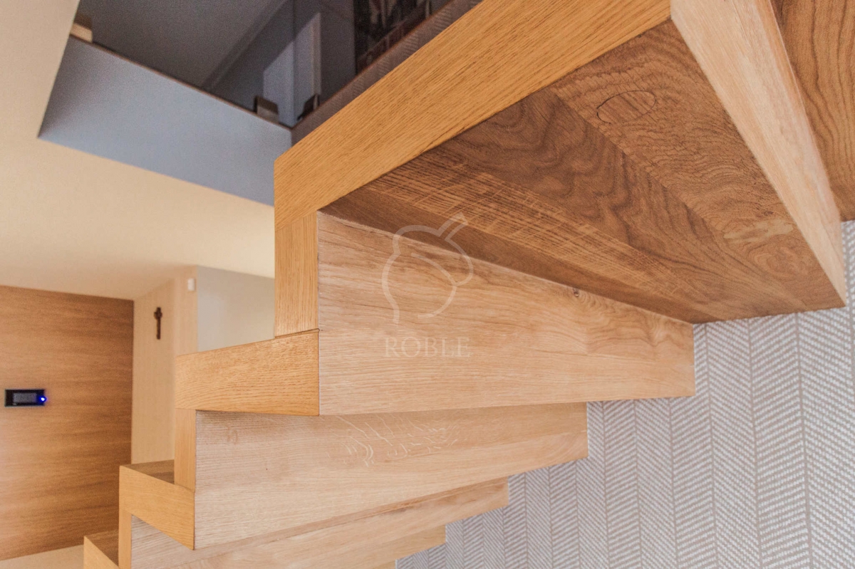 Roble Schody Dywanowe Samonośne SR24 | Drewno: dąb | Wykończenie: twardy wosk olejny | Kolor: na indywidalne zamówienie | Grubość stopni i podstopni: 8cm | Pochwyt dębowy | Dusza: Balustrada szklana na rotulach