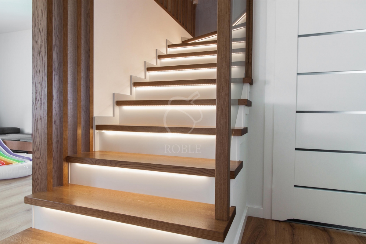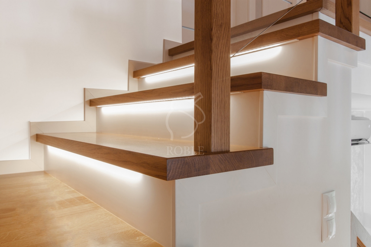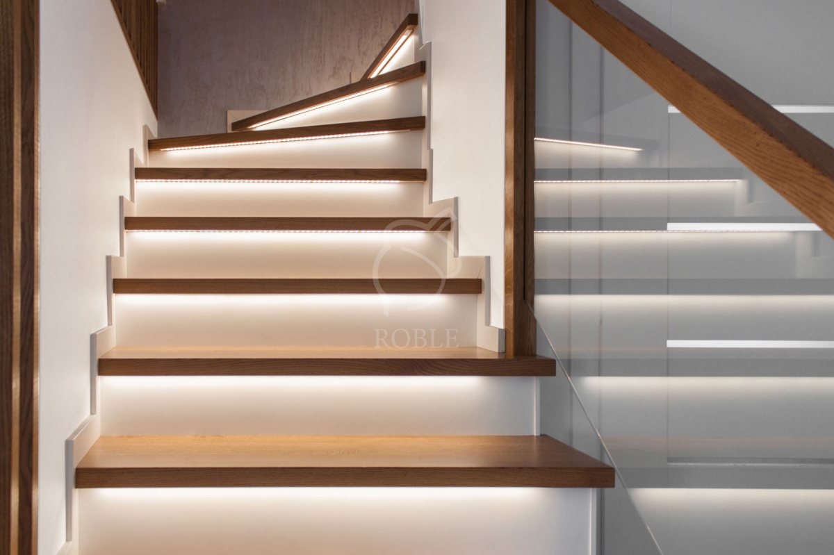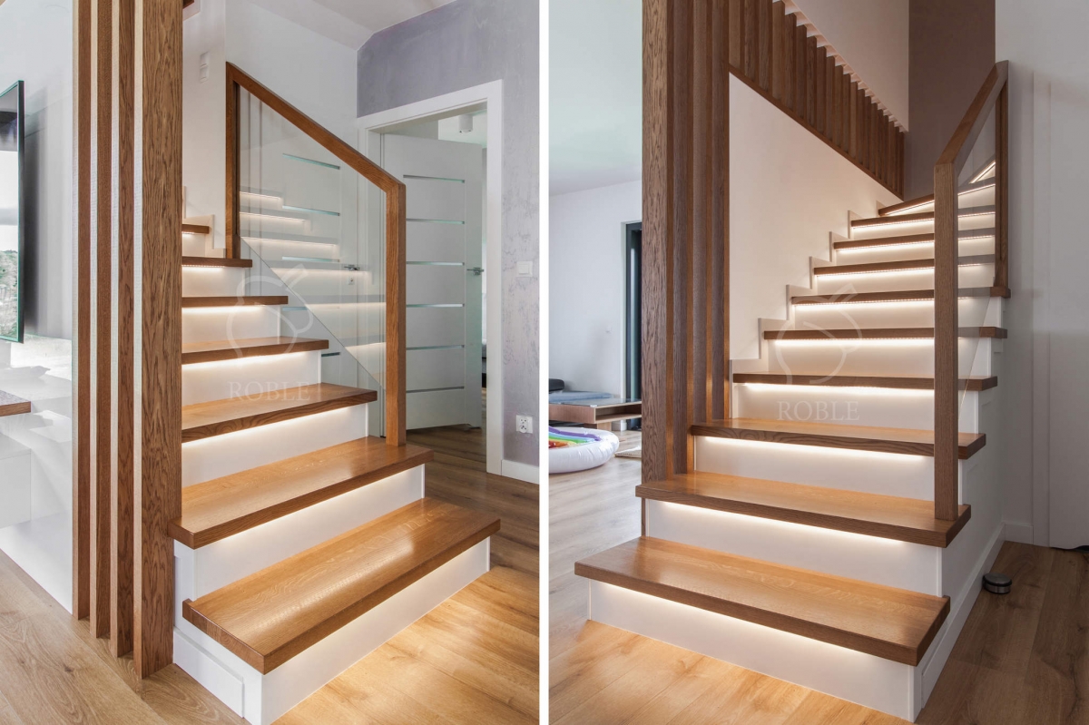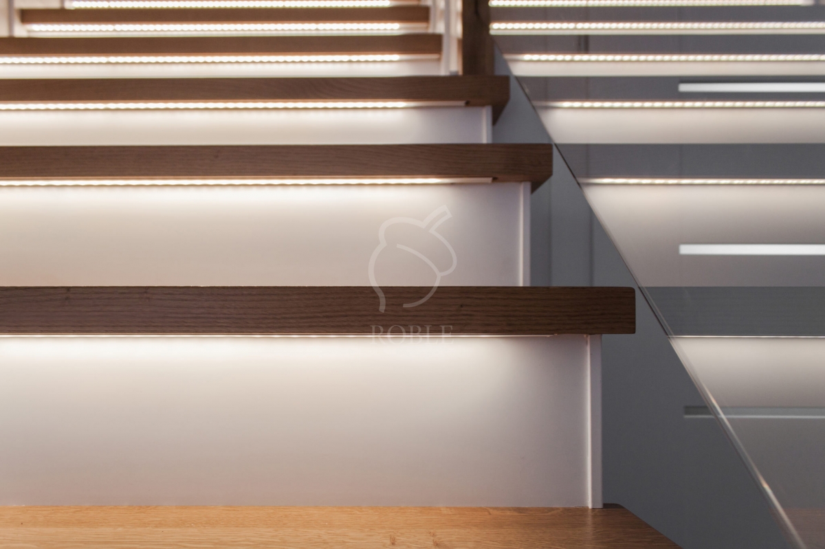 Roble Schody na Beton SR33 | Materiał stopni: dąb | Wykończenie stopni: lakier półmat | Kolor stopni: barwione indywidualnie | Materiał podstopni: lakierowany MDF | Oświetlenie LED | Balustrada: dąb + szkło