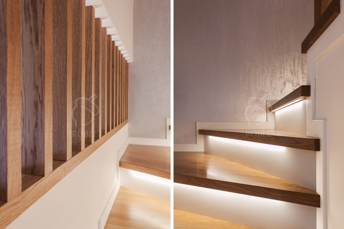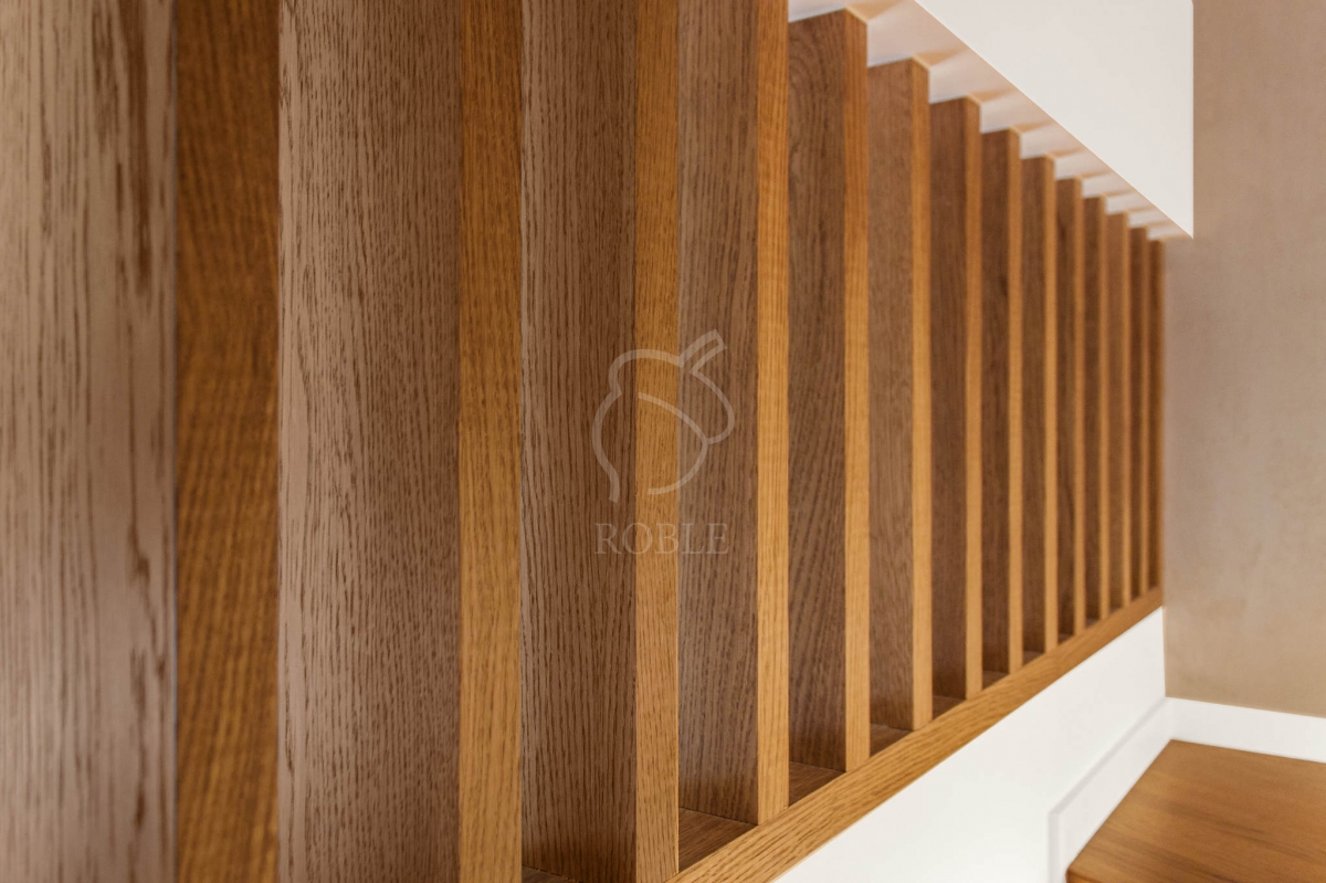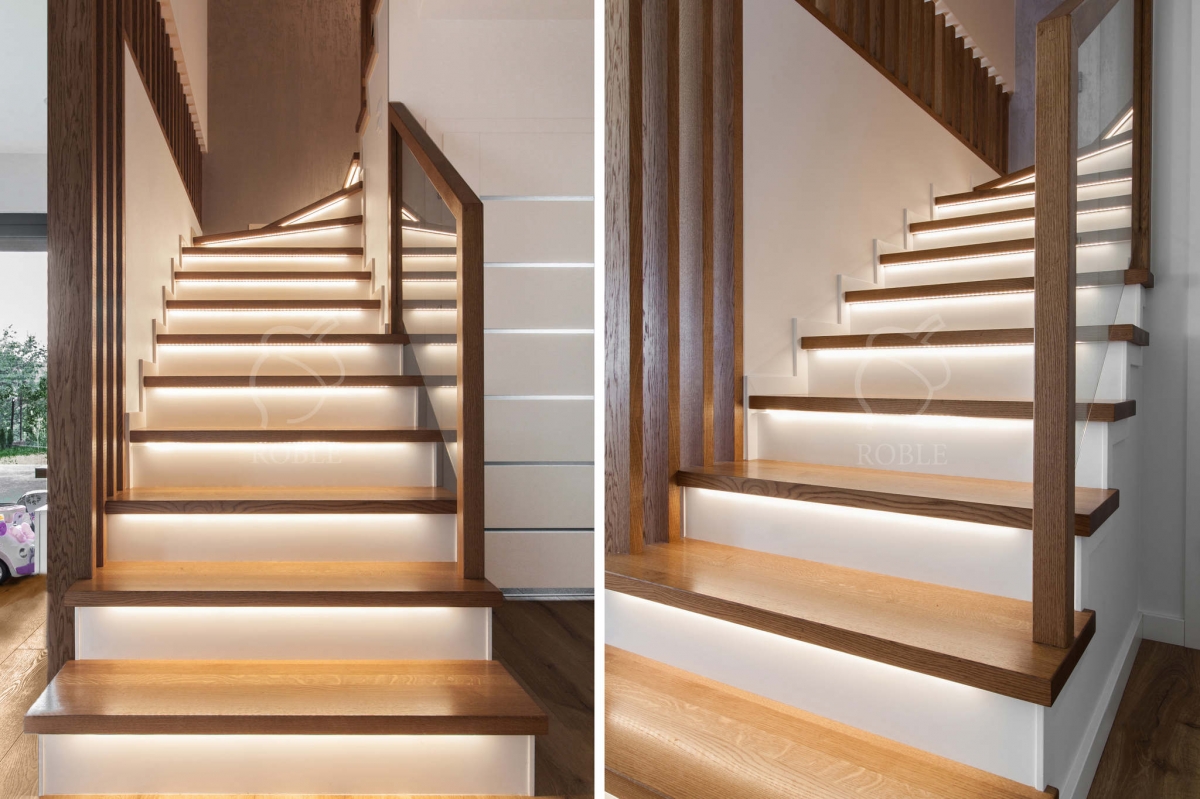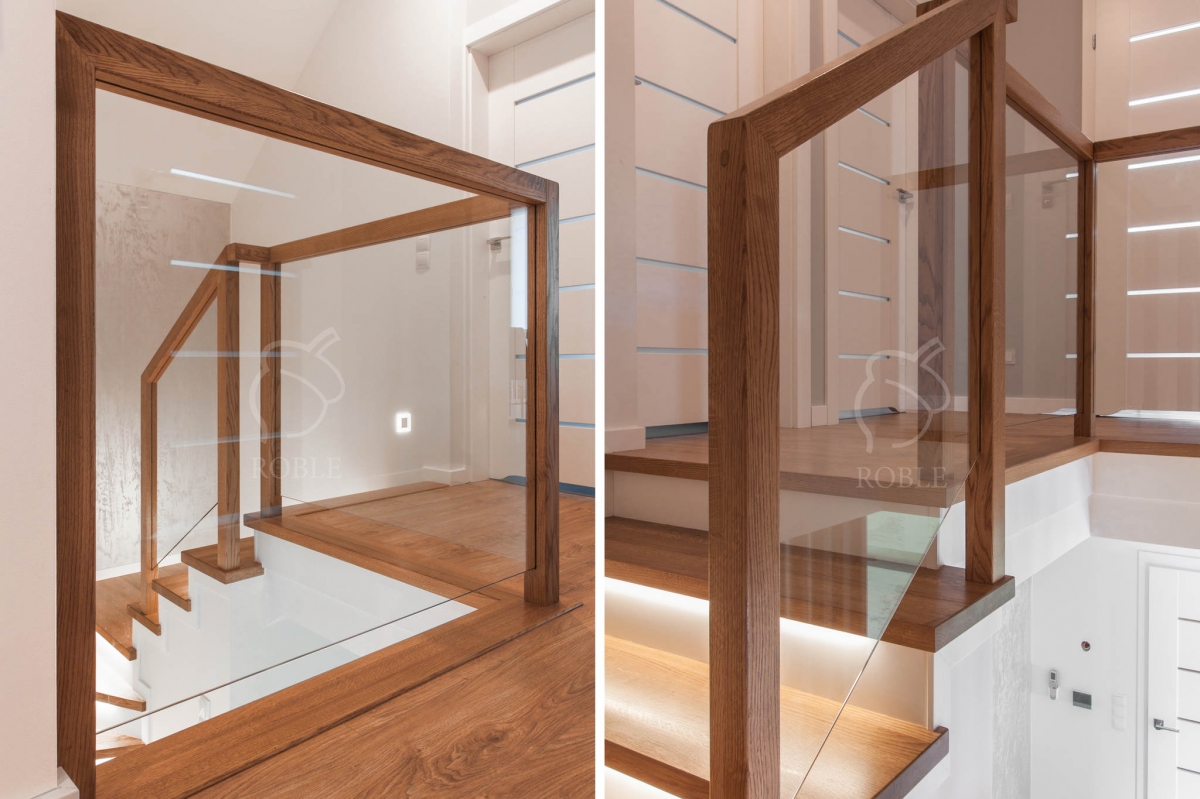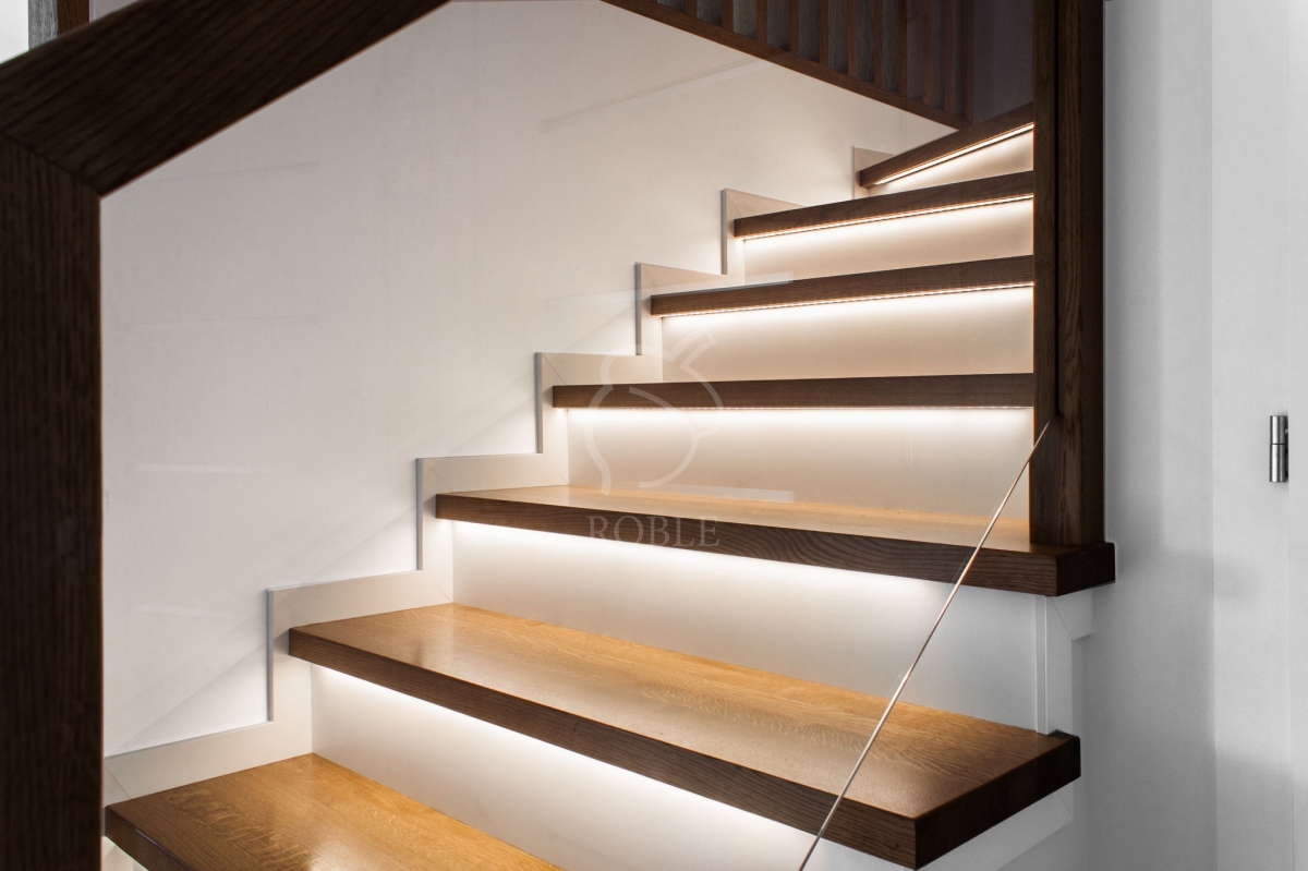 Roble Schody na Beton SR33 | Materiał stopni: dąb | Wykończenie stopni: lakier półmat | Kolor stopni: barwione indywidualnie | Materiał podstopni: lakierowany MDF | Oświetlenie LED | Balustrada: dąb + szkło