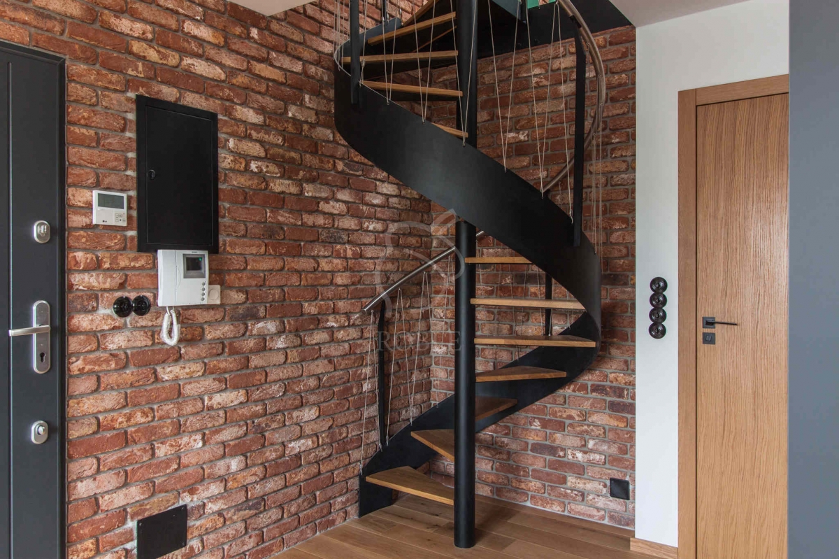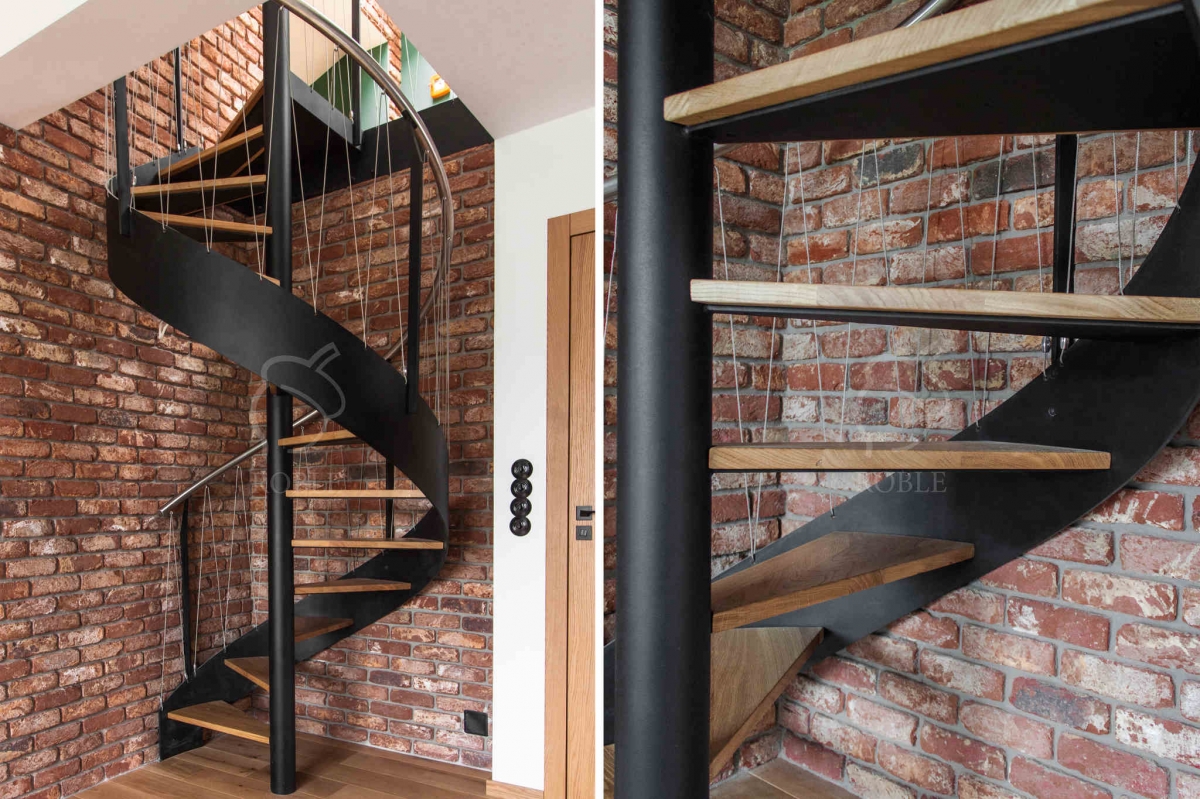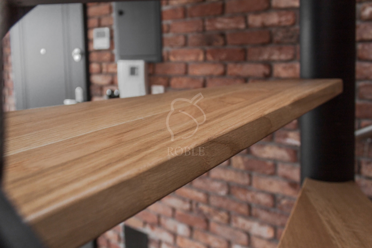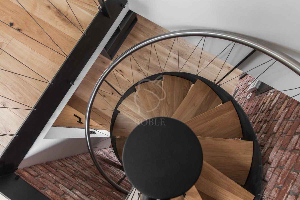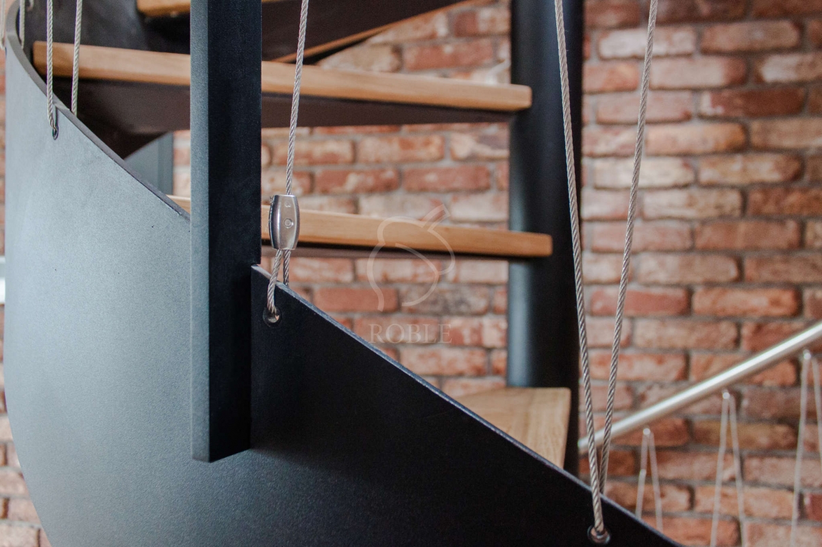 Roble Schody Spiralne SR34 | Stopień: dąb odcień naturalny | Grubość stopni: 4cm | Konstrukcja policzków ze stali | Balustrada: stalowa + relingi