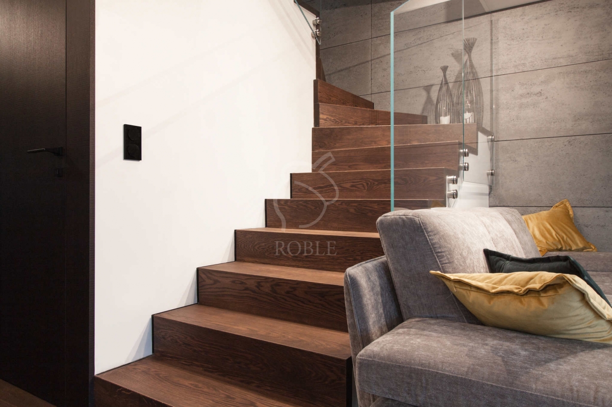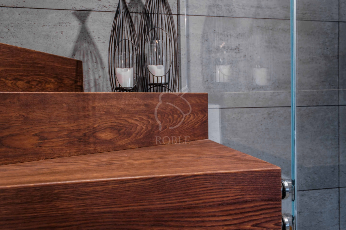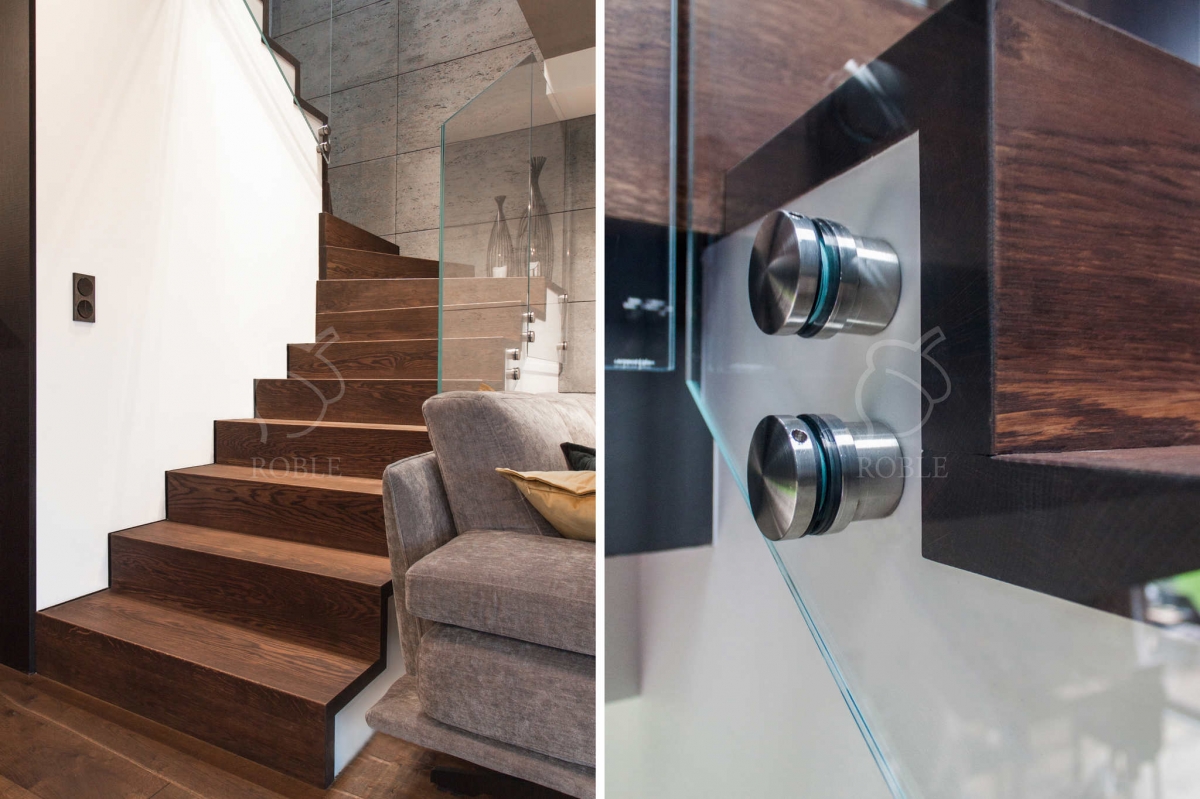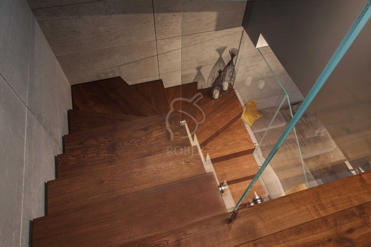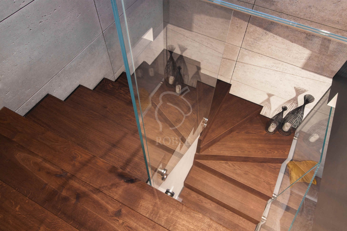 | Materiał stopni i podstopni: dąb | Szerokość biegu: 1,0m | Wykończenie stopni: twardy wosk olejny | Kolor stopni: na zamówienie, pod kolor podłogi | Balustrada: szkło float na rotulach stalowych