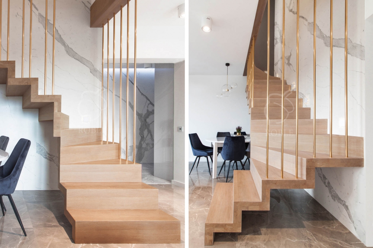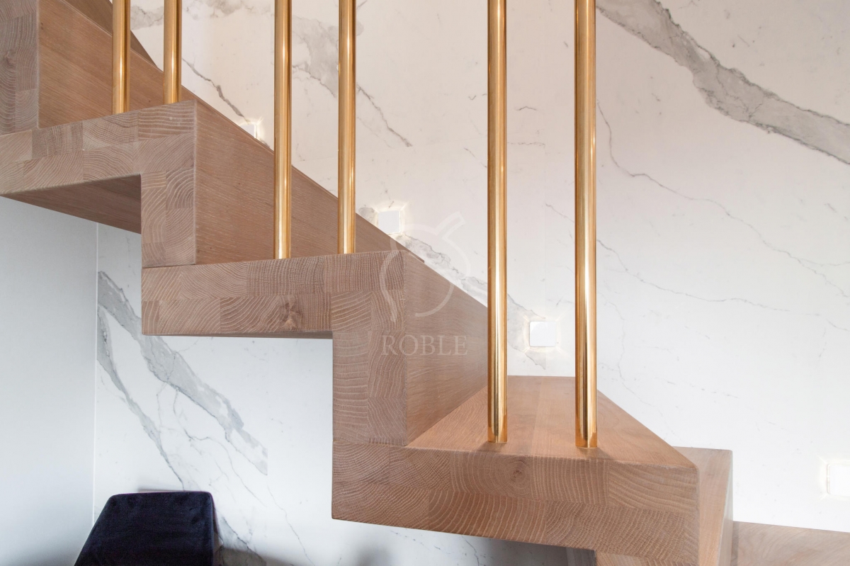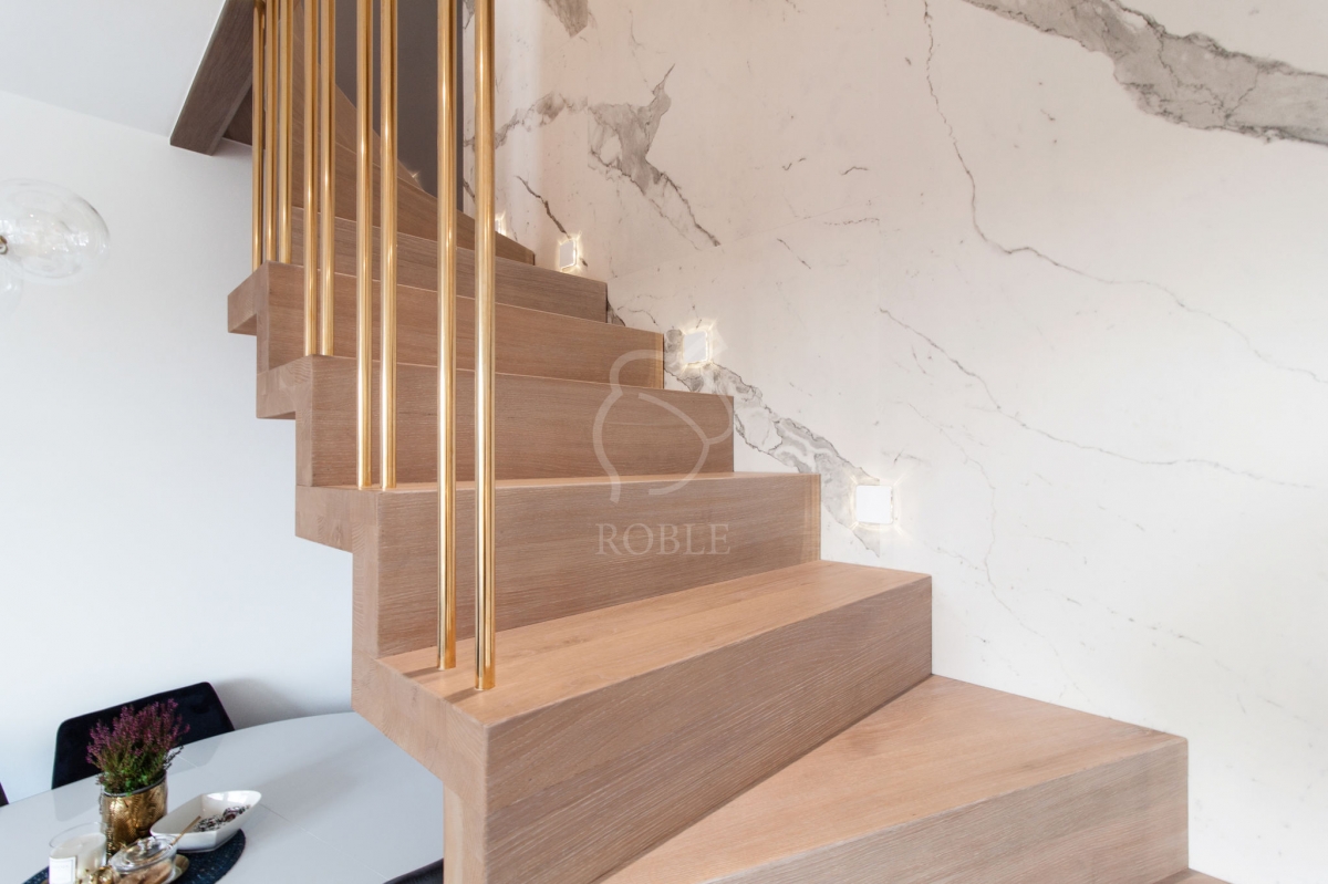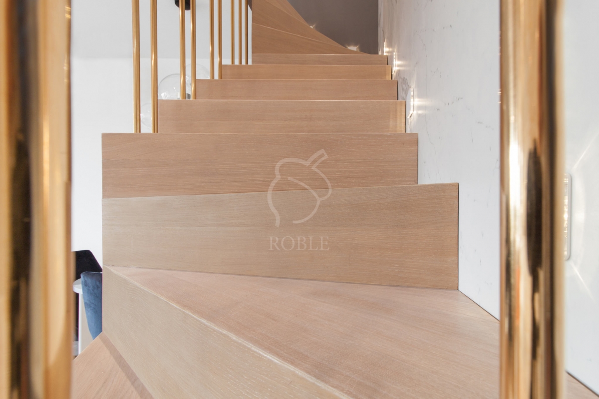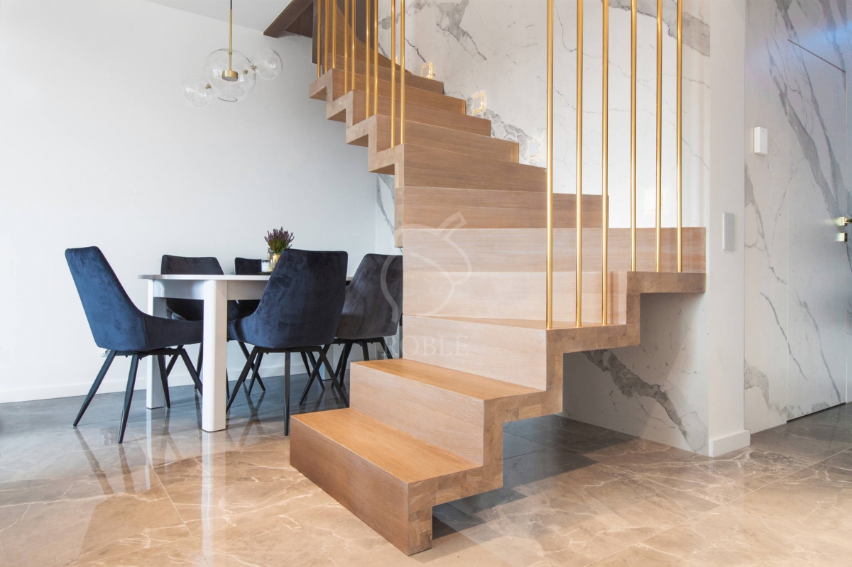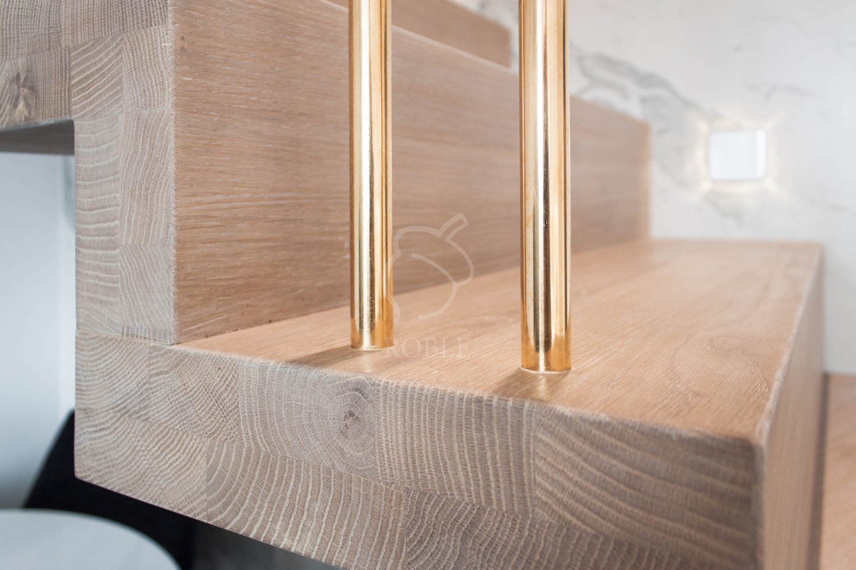 | Drewno: dąb | Wykończenie: twardy wosk olejny | Kolor: na indywidalne zamówienie | Grubość stopni i podstopni: 8cm |