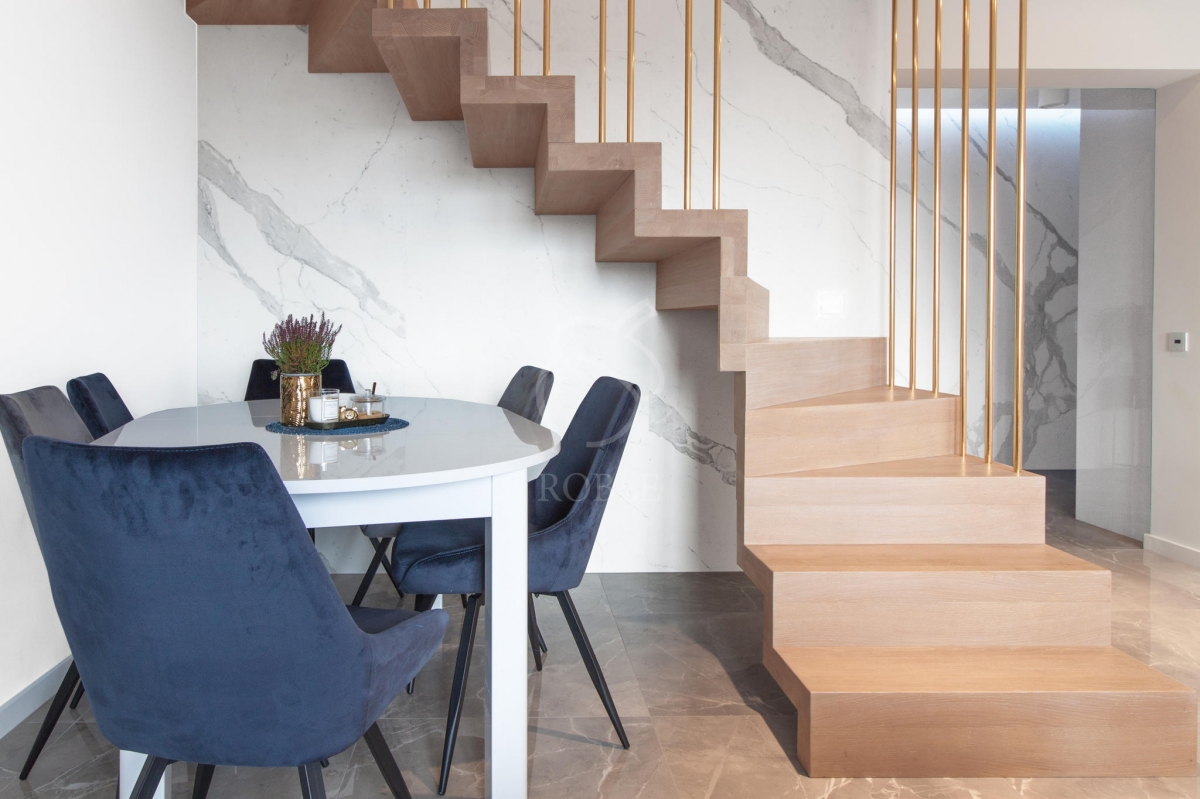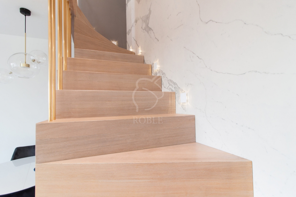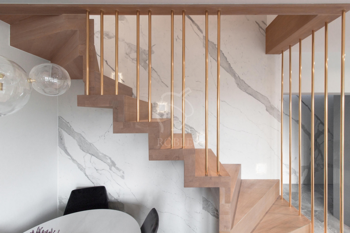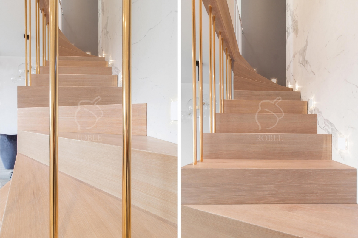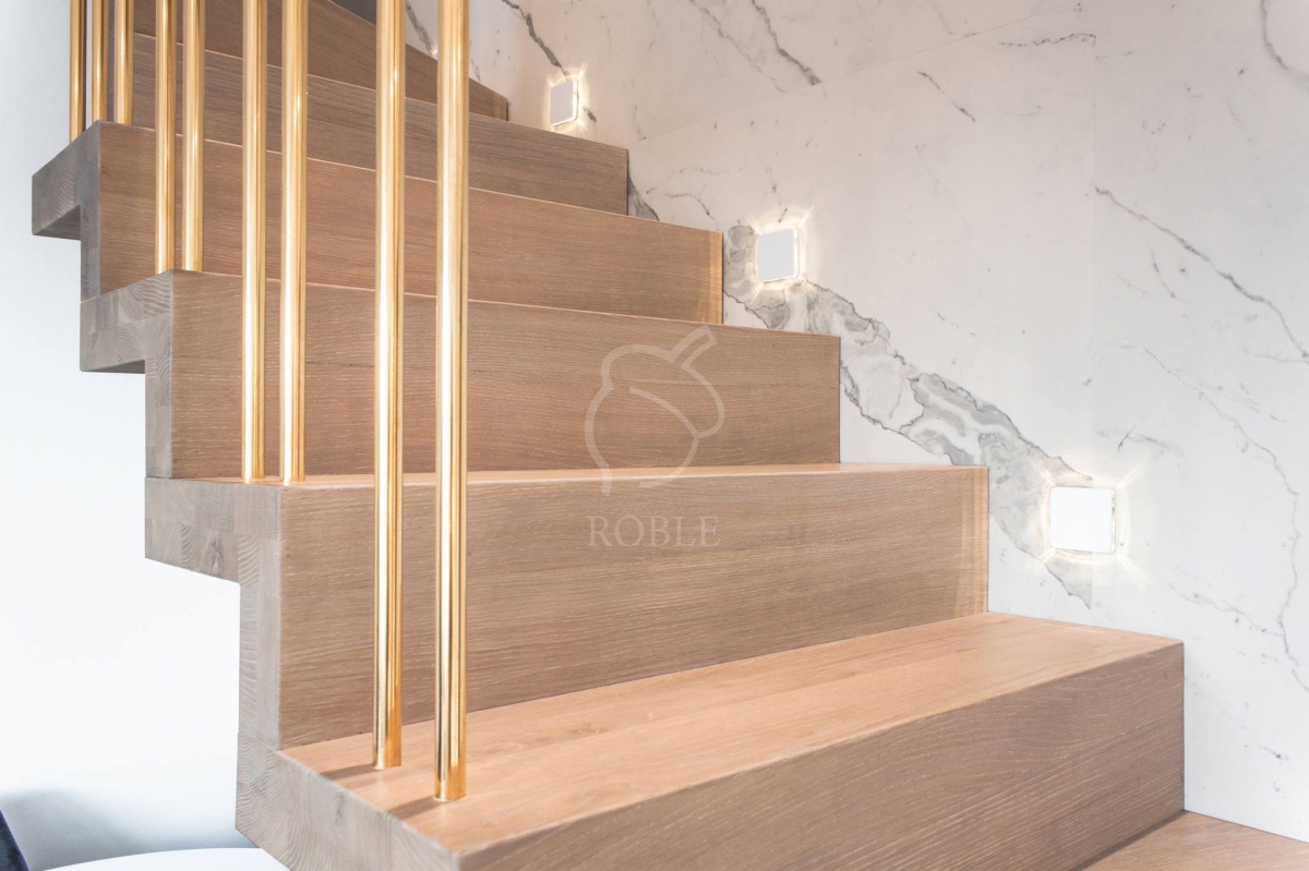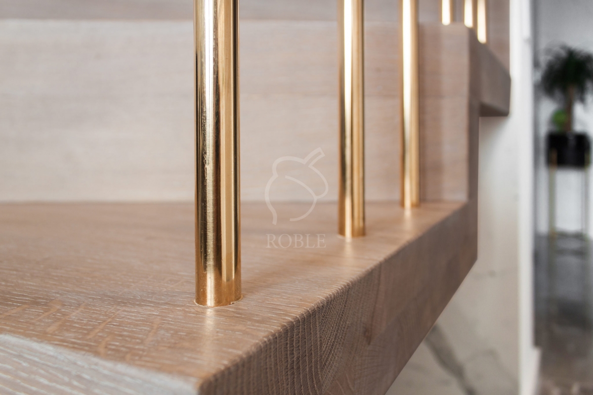 | Drewno: dąb | Wykończenie: twardy wosk olejny | Kolor: na indywidalne zamówienie | Grubość stopni i podstopni: 8cm |