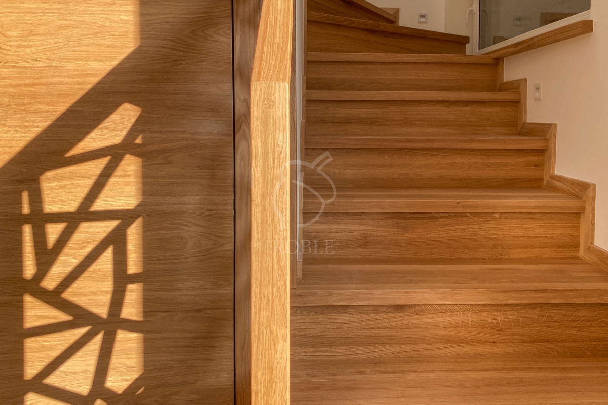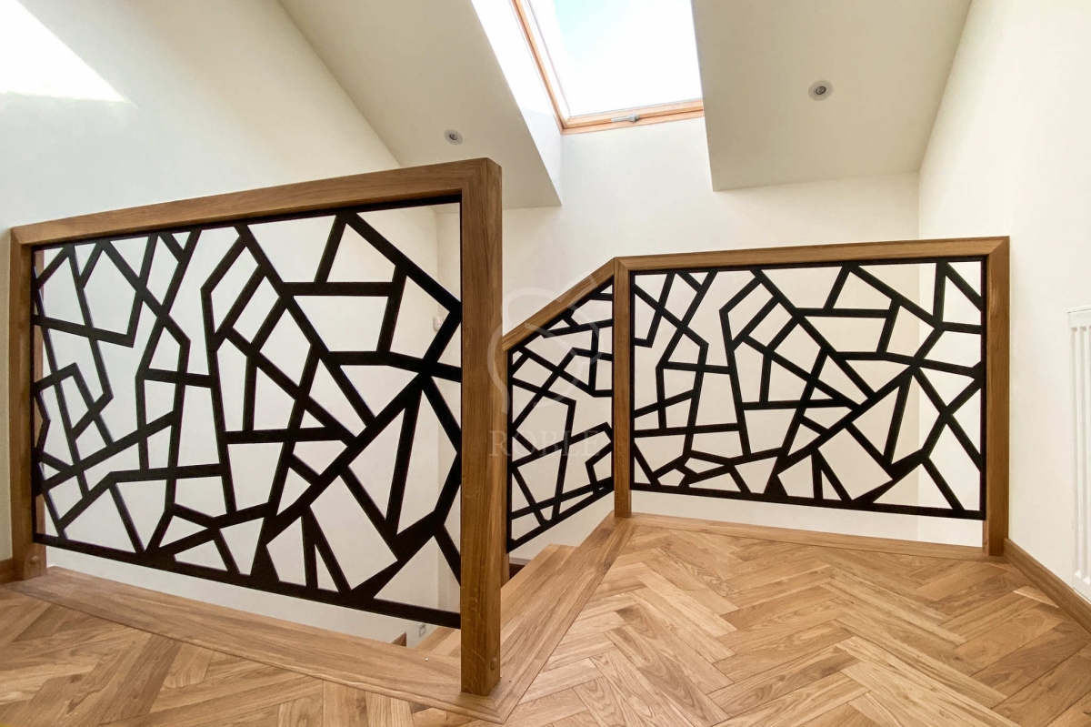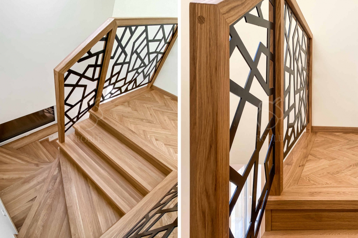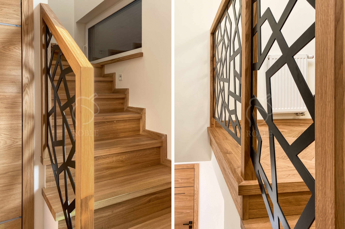 | Materiał stopni i podstopni: dąb | Wykończenie stopni: twardy wosk olejny | Kolor stopni: na zamówienie, pod kolor podłogi | Balustrada: tafla stalowa wycinana na CNC, malowana proszkowo z dębową ramą