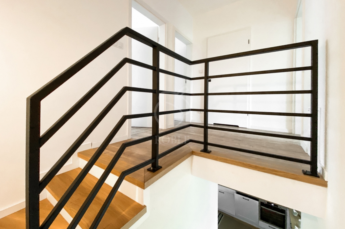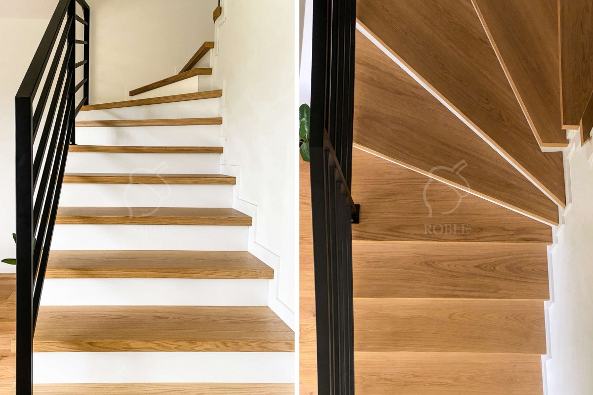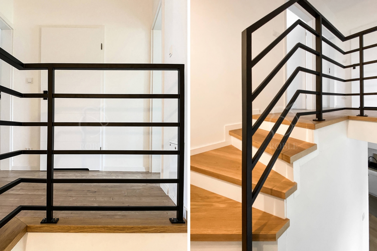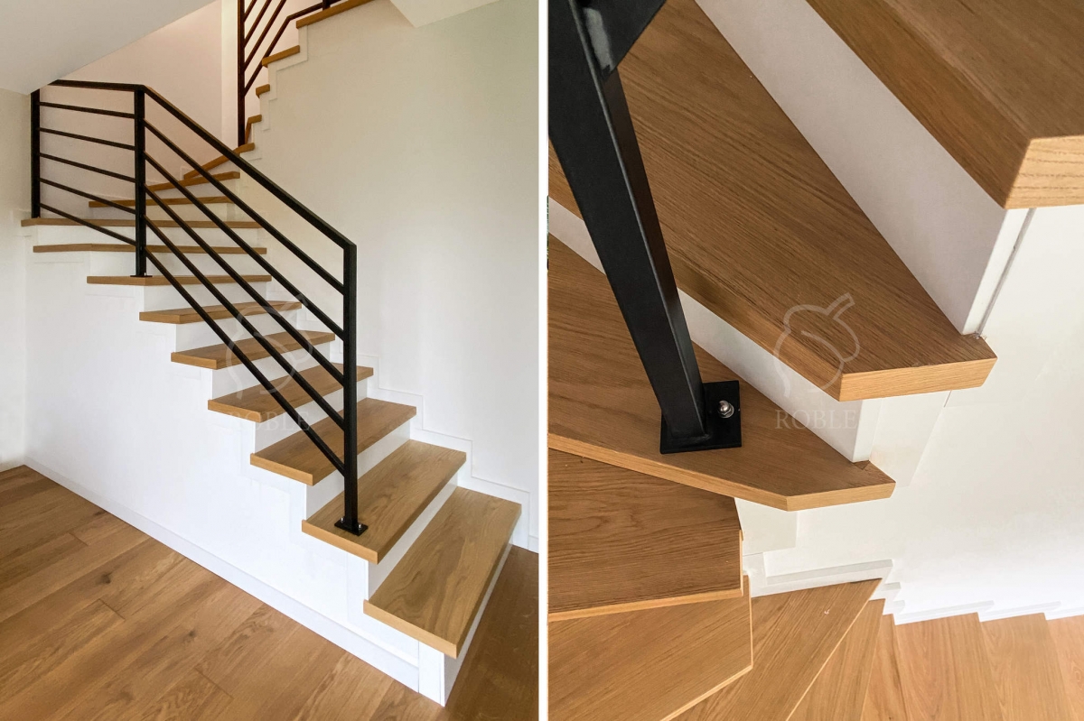 | Materiał stopnic: dąb | Wykończenie stopnic: twardy wosk olejny | Kolor stopnic: wg próbki | Materiał podstopni: lakierowany MDF | Balustrada: stalowa, malowana proszkowo