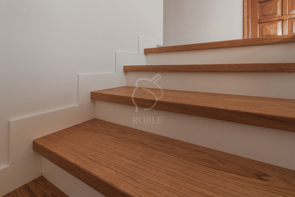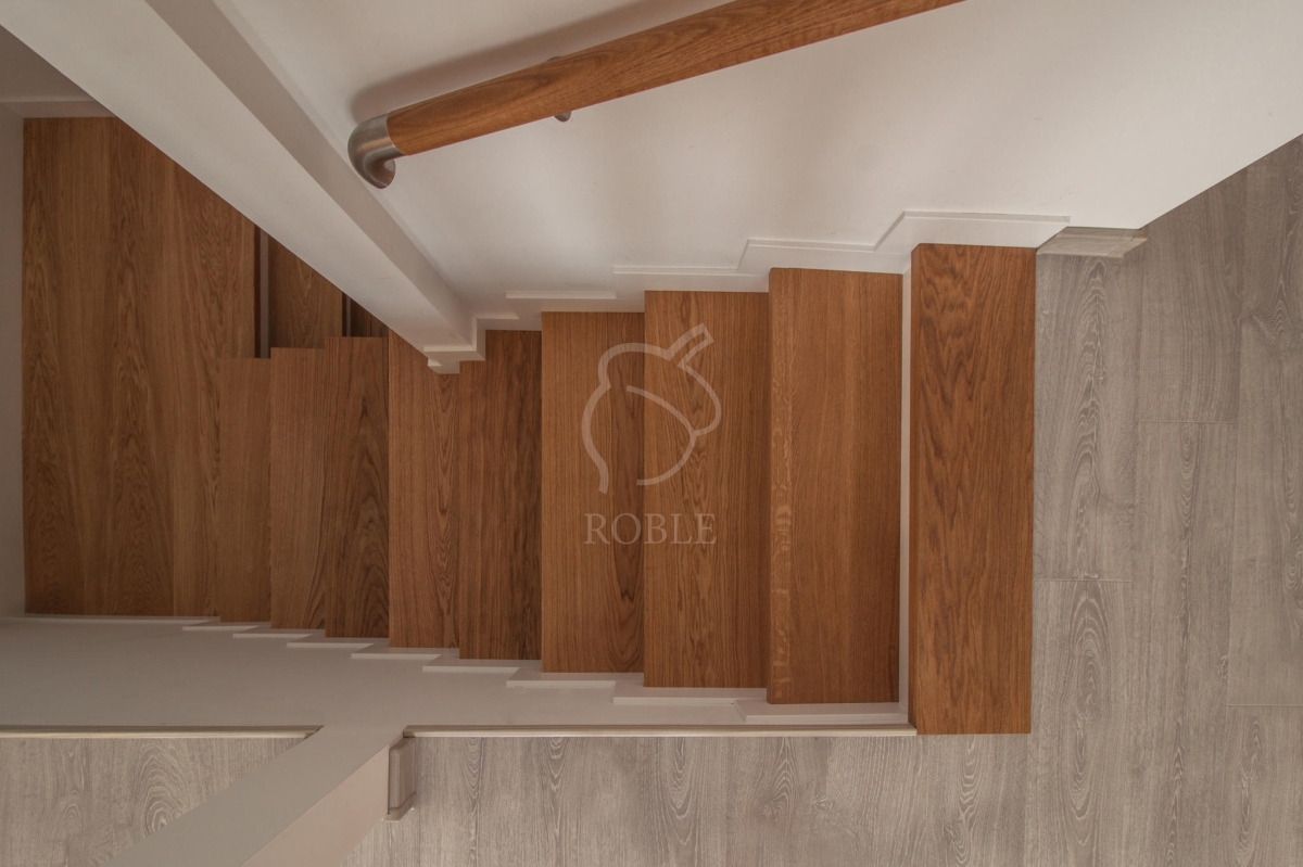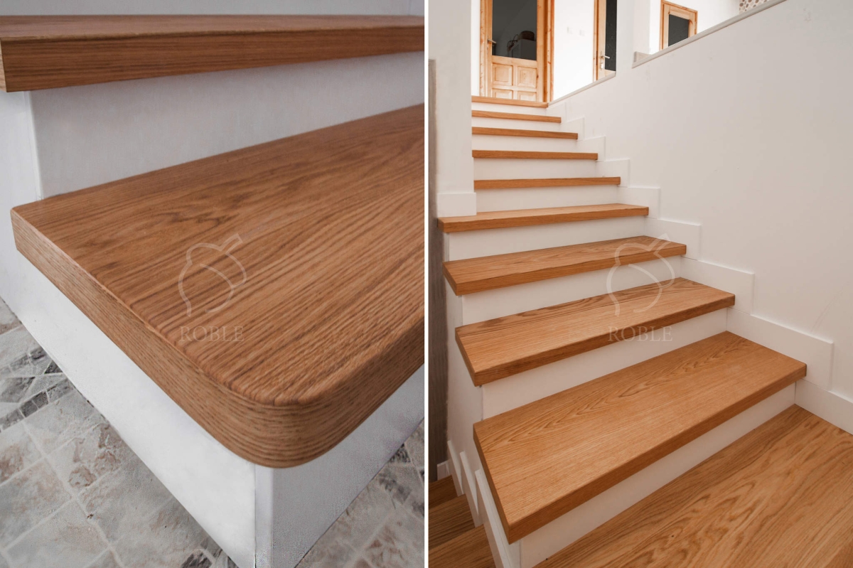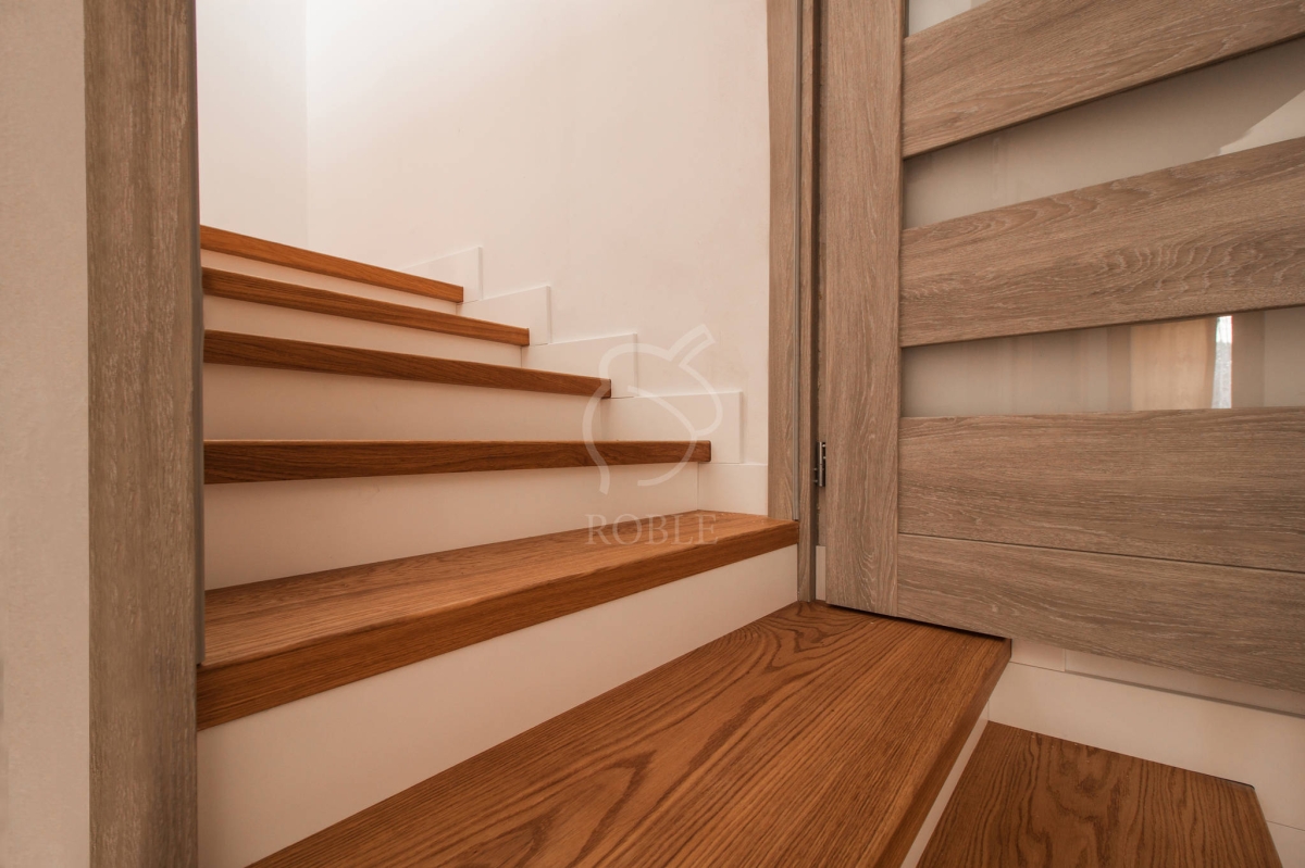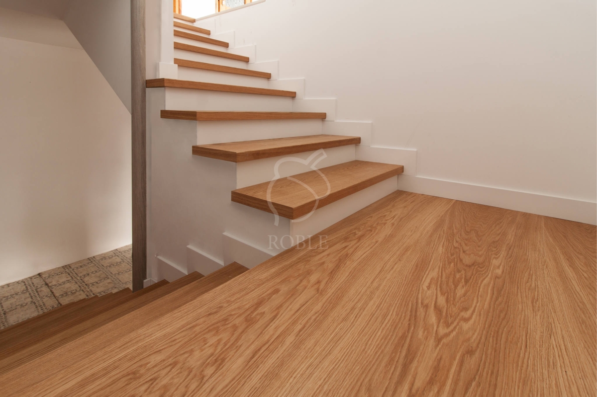Roble Schody na Beton SR47 | Materiał stopni: dąb | Wykończenie stopni: twardy wosk olejny | Kolor stopni: wg próbki | Materiał podstopni: lakierowany MDF | Listwy wykończeniowe z białego MDFu