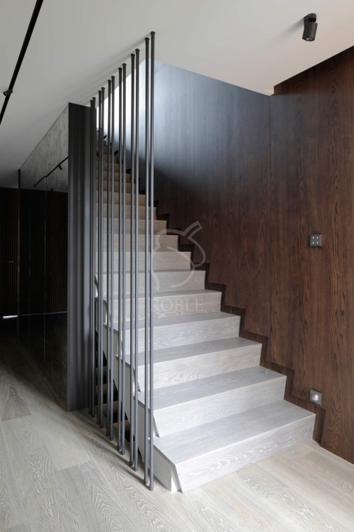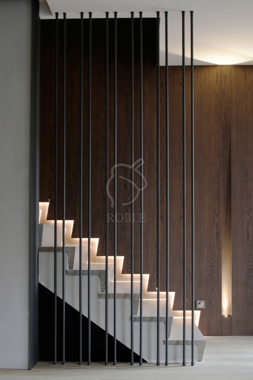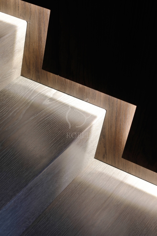 Roble Schody Dywanowe na Beton SR50 | Materiał stopnic i podstopni: dąb | Podstopnie wykonane pod kątem, frezowane na krawędziach | Wykończenie: twardy wosk olejny | Kolor: pod kolor podłogi | Realizacja projektu Tissu Architecture