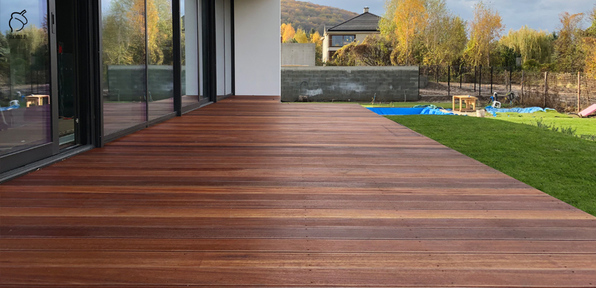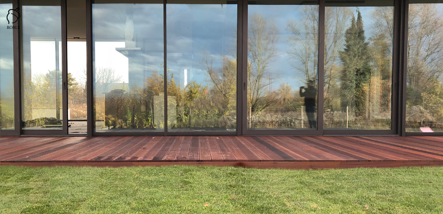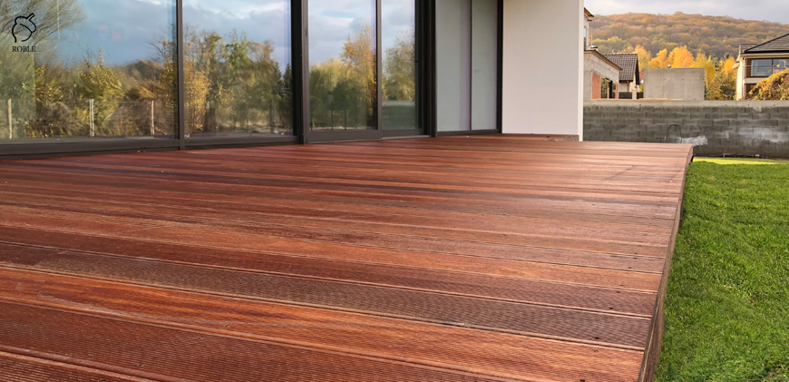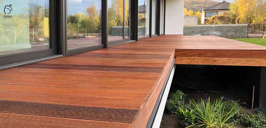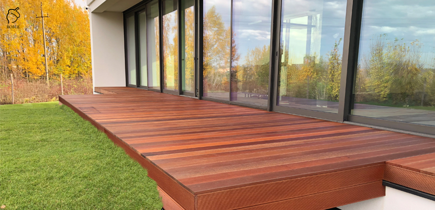 Roble Taras z Drewna Egzotycznego | Drewno: bangkirai | Długość: 3m | Szerokość: 14,5cm | Grubość: 2,1cm | Jednostronny ryfel | Klasa: I, selekcjonowana | Wykończenie: olej | Podwójne legarowanie z drewna egzotycznego