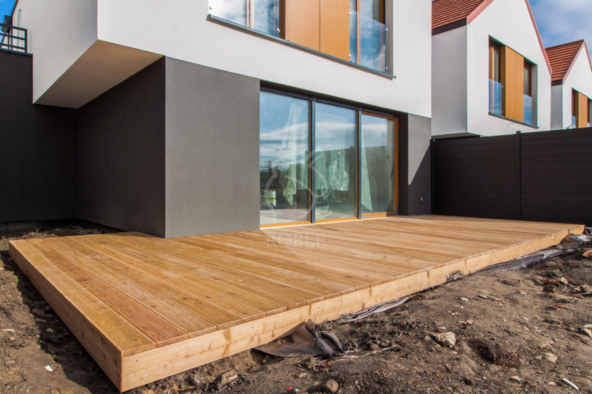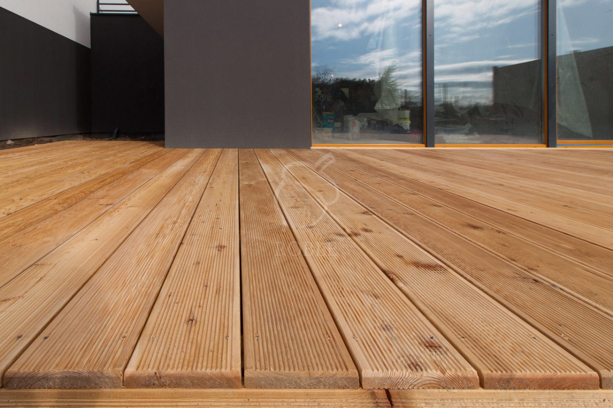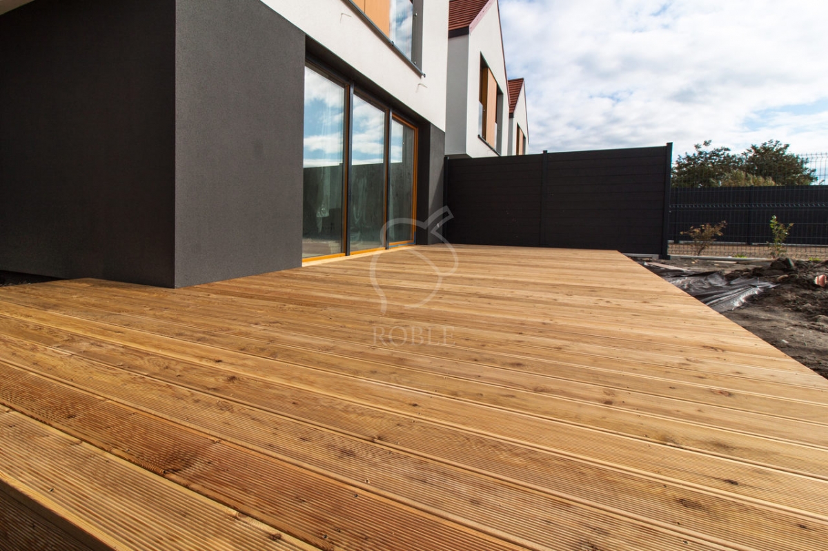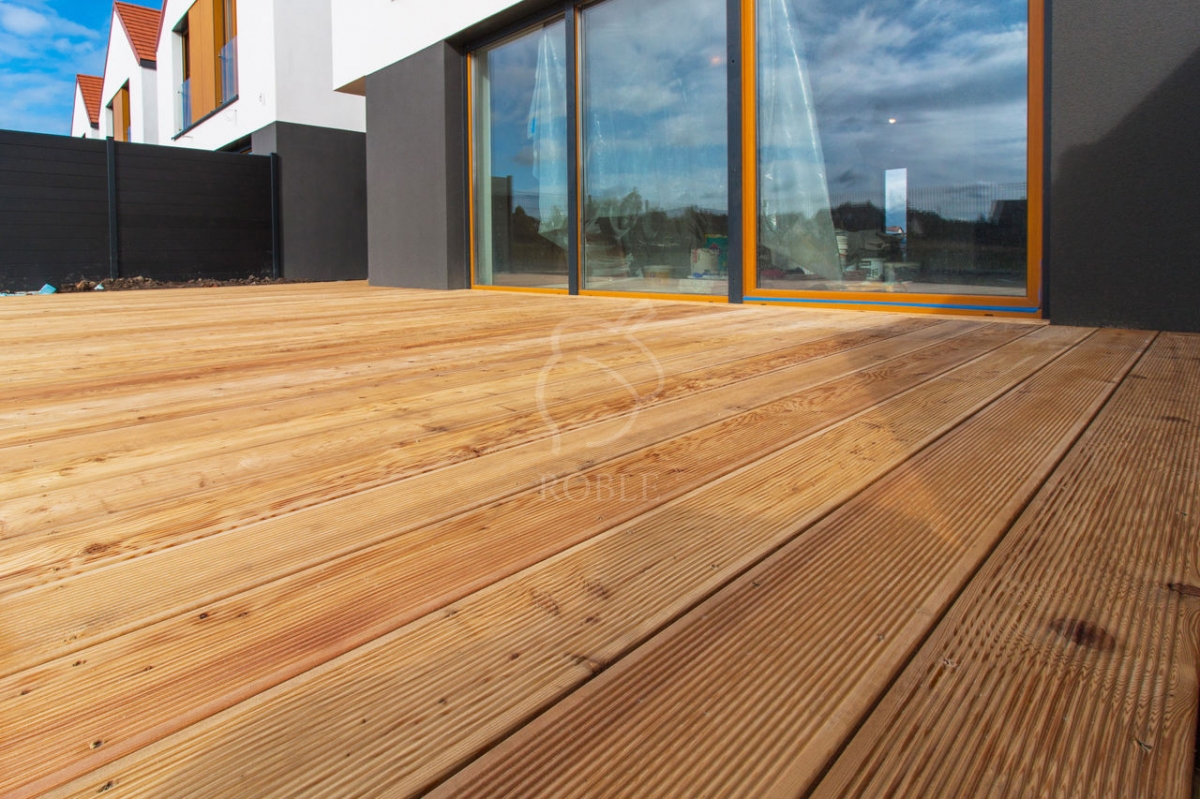Roble Taras z Modrzewia Syberyjskiego | Długość: do 4m | Szerokość: 14cm | Grubość: 2,4cm | Dwustronny ryfel | Klasa: KD | Wykończenie: olej | Podkonstrukcja ze zbrojonych słupów betonowych