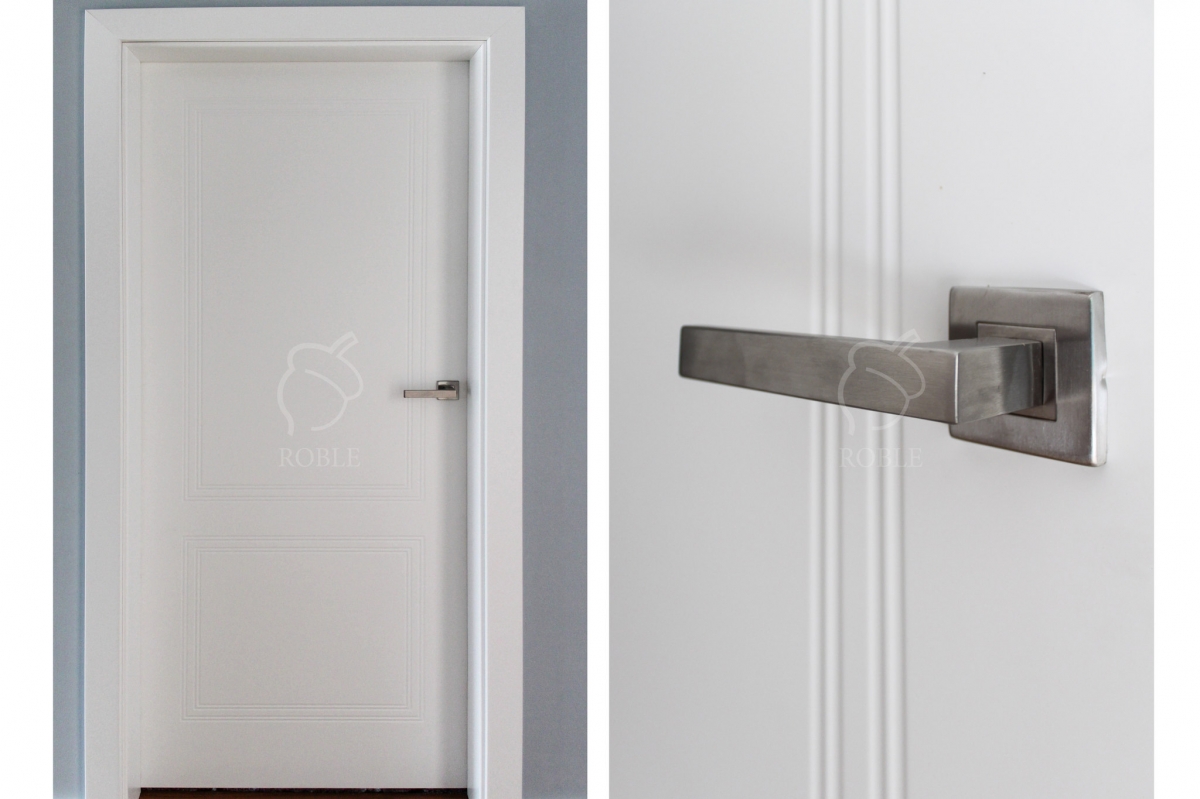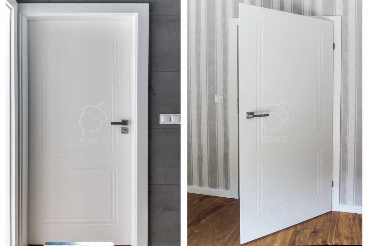 Roble Drzwi Wewnętrzne Dębowe | Drewno: dąb | Wymiary: 90 x 203cm | Wykończenie: biały lakier matowy | Ryflowanie wg projektu | Drzwi z przylgą | Ościeżnica regulowana | Zamki magnetyczne | Zawiasy chowane