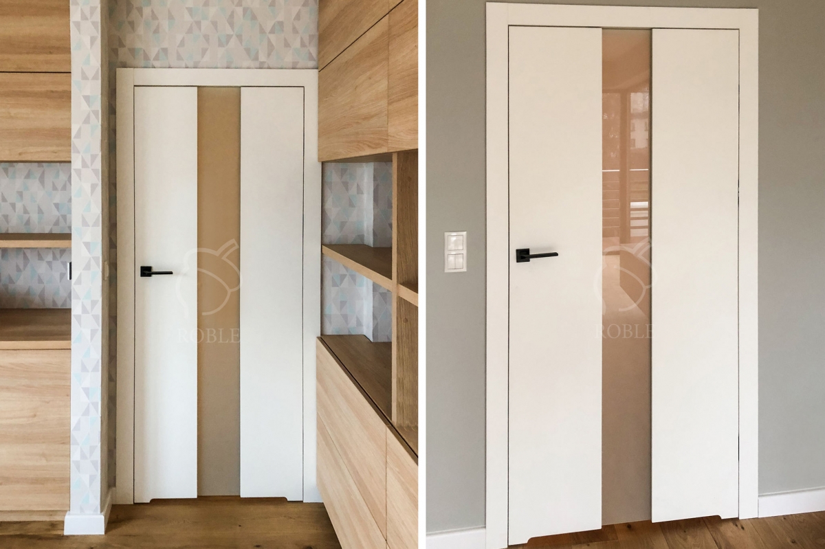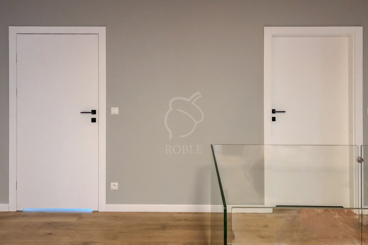 Roble Drzwi Wewnętrzne Dębowe | Drewno: dąb | Wymiary: 90 x 200cm | Wykończenie: lakier matowy, biały | Drzwi bezprzylgowe | Ościeżnica regulowana | Zamki magnetyczne | Zawiasy chowane | Wstawka ze szkła mlecznego