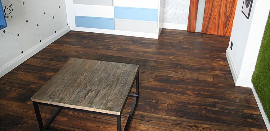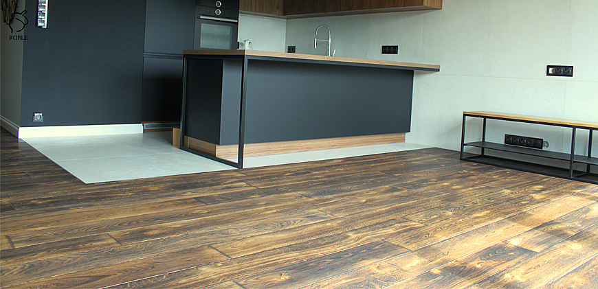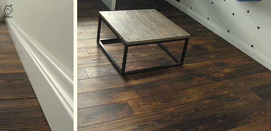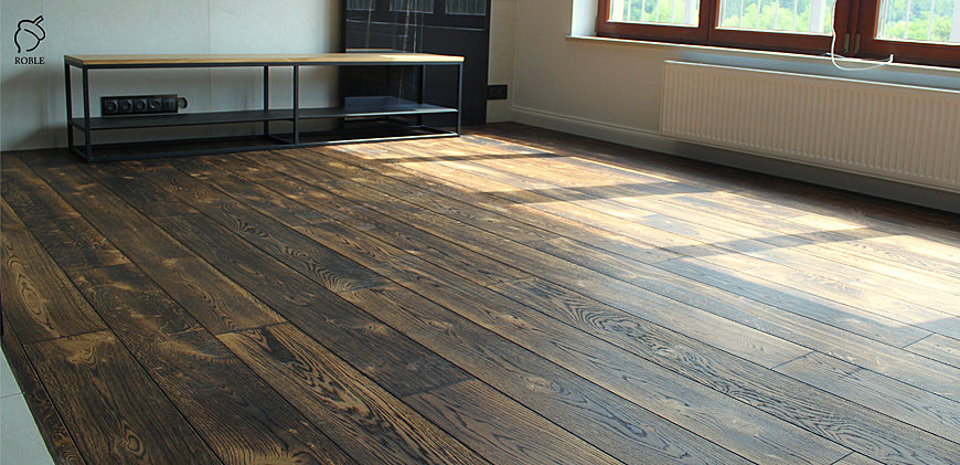 Roble Deska Warstwowa | Drewno: dąb | Kolor: palona | Klasa: rustic | Długości: mix od 1,0 do 2,1m | Szerokość: 14cm | Grubość: 14mm (4mm litego drewna) | Wykończenie: twardy wosk olejny | 4-stronnie fazowana | Strukturyzacja powierzchni